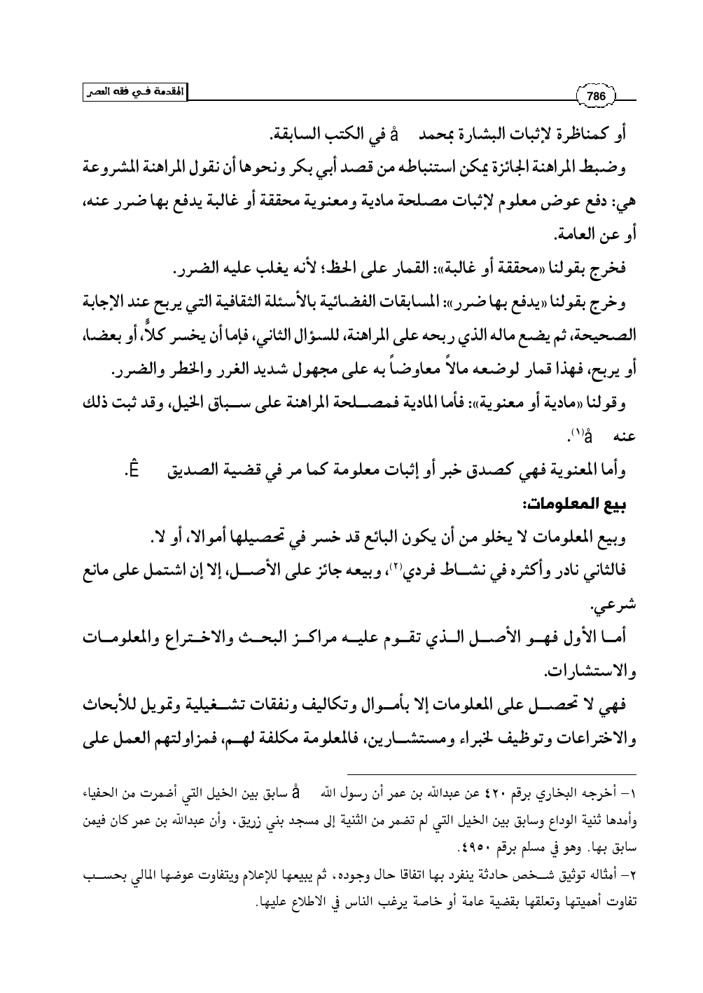 وخرج بقولنا «يدفع بها ضرر»: المسابقات الفضائية بالأسئلة الثقافية التي يربح عند الإجابة الصحيحة، ثم يضع ماله الذي ربحه على المراهنة، للسؤال الثاني، فإما أن يخسر كلاًّ، أو بعضا، أو يربح، فهذا قمار لوضعه مالاً معاوضاً به على مجهول شديد الغرر والخطر والضرر.