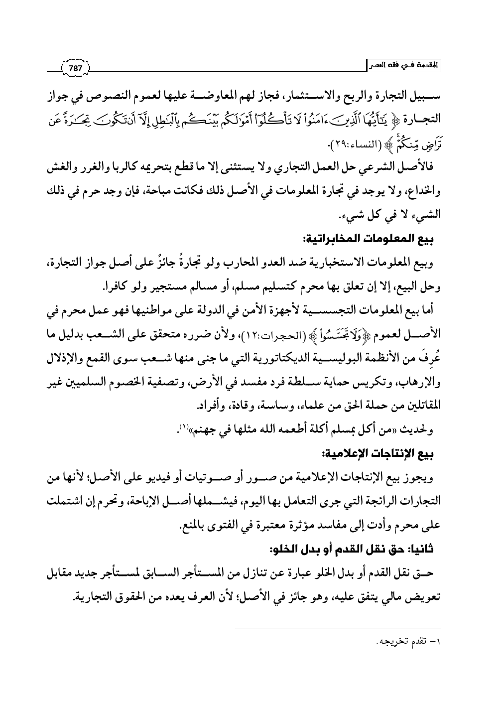 فالأصل الشرعي حل العمل التجاري ولا يستثنى إلا ما قطع بتحريمه كالربا والغرر والغش والخداع، ولا يوجد في تجارة المعلومات في الأصل ذلك فكانت مباحة، فإن وجد حرم في ذلك الشيء لا في كل شيء.