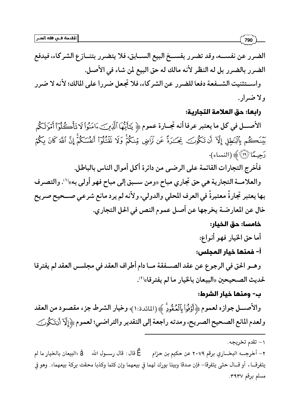 وهو الحق في الرجوع عن عقد الصفقة ما دام أطراف العقد في مجلس العقد لم يفترقا لحديث الصحيحين «البيعان بالخيار ما لم يفترقا» (¬2).