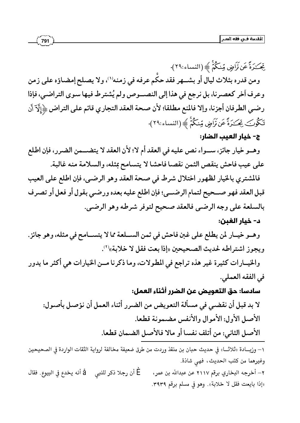 وهو خيار لمن يطلع على غبن فاحش في ثمن السلعة مما لا يتسامح في مثله، وهو جائز. ويجوز اشتراطه لحديث الصحيحين «إذا بعت فقل لا خلابة» (¬2).