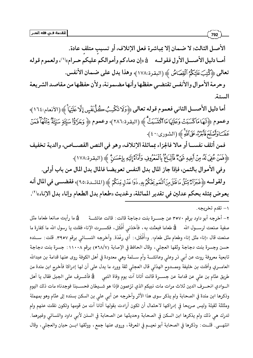 (¬2) - أخرجه أبو داود برقم 3570 عن جسرة بنت دجاجة قالت: قالت عائشة رضي الله عنها ما رأيت صانعا طعاما مثل صفية صنعت لرسول الله صلى الله عليه وسلم طعاما فبعثت به، فأخذني أَفْكَل، فكسرت الإناء فقلت يا رسول الله ما كفارة ما صنعت قال «إناء مثل إناء وطعام مثل طعام». و «أَفْكَل»: أي رعْدَة. وأخرجه النسائي برقم 3957. قلت: سنده حسن وجسرة بنت دجاجة وثقها العجلي، وقال الحافظ في الإصابة (7/ 568) برقم 11008: جسرة بنت دجاجة تابعية معروفة روت عن أبي ذر وعلي وعائشة وأم سلمة وهي معدودة في أهل الكوفة روى عنها قدامة بن عبدالله العامري وأفلت بن خليفة وممدوح الهذلي قال العجلي ثقة وورد ما يدل على أن لها إدراكا فأخرج ابن مندة من طريق عثام بن علي عن قدامة عن جسرة قالت أتانا آت يوم وفاة النبي صلى الله عليه وسلم فأشرف على الجبل فقال يا أهل الوادي انحرف الدين ثلاث مرات مات نبيكم الذي تزعمون فإذا هو شيطان فحسبنا فوجدناه مات ذلك اليوم وذكرها ابن مندة في الصحابة ولم يذكر سوى هذا الأثر وأخرجه عن أبي علي بن السكن بسنده إلى عثام وهو بمهملة ومثلثة ثقيلة وليس صريحا في إدراكها لاحتمال أن تكون أرادت بقولها أتانا آت من قومها وتكون نقلت عنهم ولم تدرك هي ذلك ولم يذكرها ابن السكن في الصحابة وحديثها عن الصحابة في السنن لأبي داود والنسائي وغيرهما. انتهى. قلت: وذكرها في الصحابة أبو نعيم في المعرفة، وروى عنها جمع، ووثقها ابن حبان والعجلي، وقال الذهبي وثقت، وذكرها ابن الأثير في أسد الغابة .. فعلى هذا فحديثها حسن، وقد حسنه الأرناؤوط في المسند، وضعفه الألباني، والصحيح تحسين الأرناؤوط؛ لأنه الموافق لقواعد علم الجرح والتعديل، ثم اطلعت على قول الحافظ في الفتح (5/ 125): إسناده حسن. ومما يؤكد صحة الحديث أن القصة في صحيح البخاري برقم 5225 من حديث أنس رضي الله عنه قال: كان النبي صلى الله عليه وسلم عند بعض نسائه فأرسلت إحدى أمهات المؤمنين بصحفة فيها طعام فضربت التي النبي صلى الله عليه وسلم في بيتها يد الخادم فسقطت الصحفة فانفلقت فجمع النبي صلى الله عليه وسلم فلق الصحفة ثم جعل يجمع فيها الطعام الذي كان في الصحفة ويقول: غارت أمكم، ثم حبس الخادم حتى أتي بصحفة من عند التي هو في بيتها فدفع الصحفة الصحيحة إلى التي كسرت صحفتها وأمسك المكسورة في بيت التي كسرت.