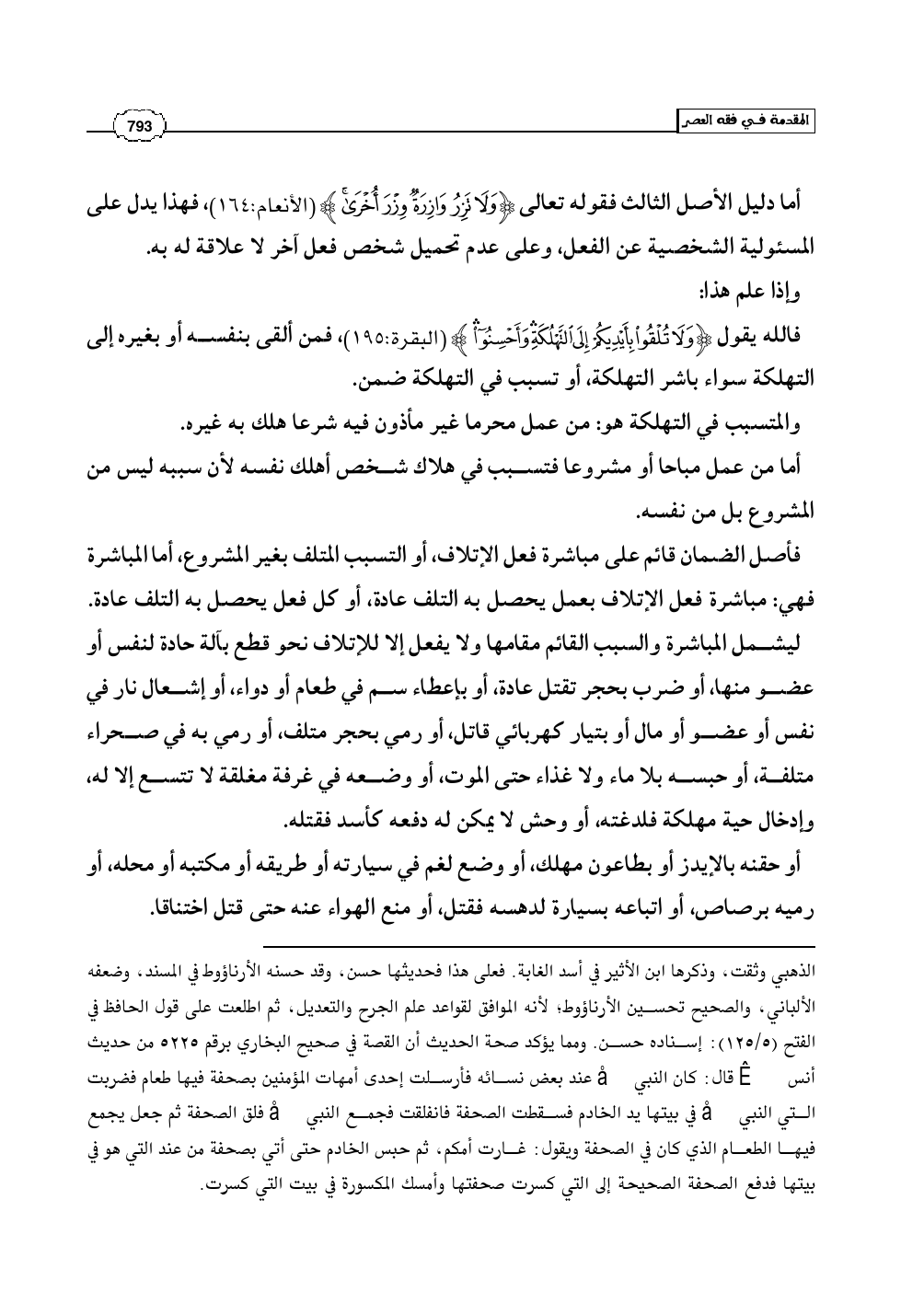 فالله يقول (وَلاَ تُلْقُوا بِأَيْدِيكُمْ إِلَى التَّهْلُكَةِ وَأَحْسِنُوَا) (البقرة: 195)، فمن ألقى بنفسه أو بغيره إلى التهلكة سواء باشر التهلكة، أو تسبب في التهلكة ضمن.