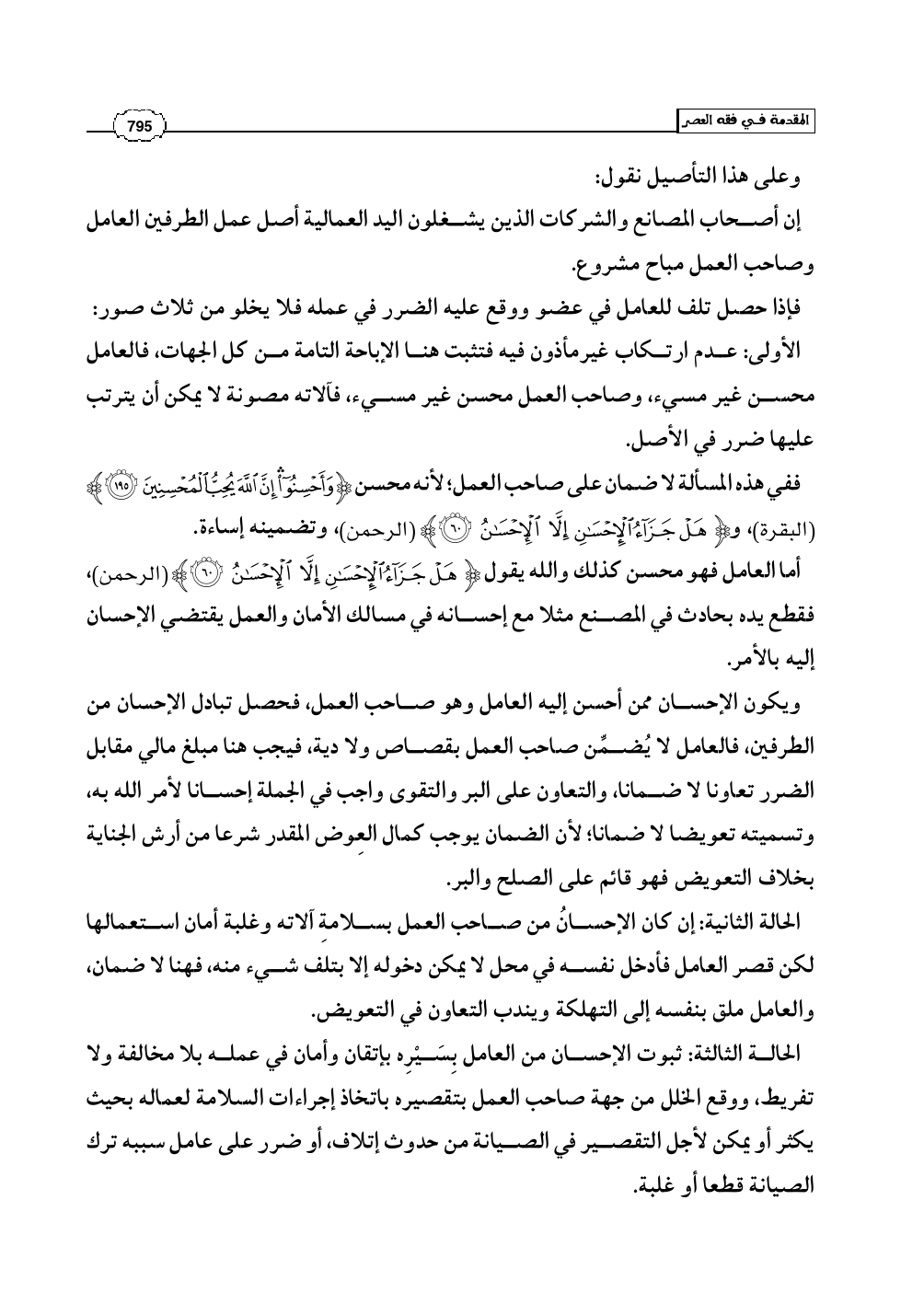 أما العامل فهو محسن كذلك والله يقول (هَلْ جَزَاء الإِحْسَانِ إِلاَّ الإِحْسَانُ) (الرحمن: 60)، فقطع يده بحادث في المصنع مثلا مع إحسانه في مسالك الأمان والعمل يقتضي الإحسان إليه بالأمر.