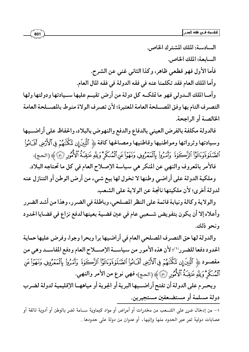 والدولة لها حق التصرف المصلحي العام في أراضيها برا وبحرا وجوا، وفرض عليها حماية الحدود دفعا للضرر (¬1)؛ لأن هذه الأمور من سياسة الإصلاح العام ودفع المفاسد وهي من مقصود (الَّذِينَ إِن مَّكَّنَّاهُمْ فِي الأَرْضِ أَقَامُوا الصَّلاةَ وَآتَوُا الزَّكَاةَ وَأَمَرُوا بِالْمَعْرُوفِ وَنَهَوْا عَنِ الْمُنكَرِ وَلِلَّهِ عَاقِبَةُ الأُمُورِ) (الحج: 41)، فهي نوع من الأمر والنهي.