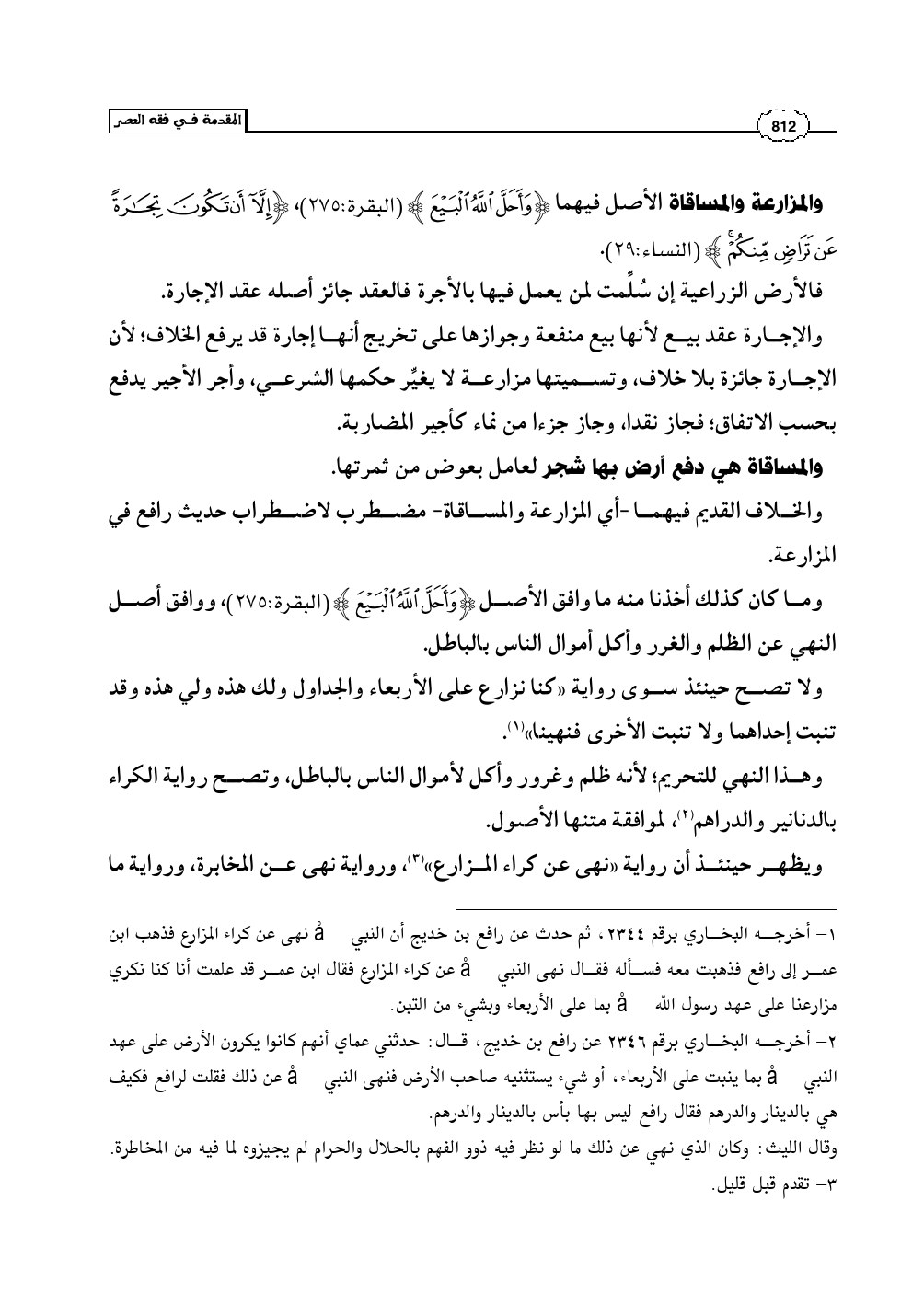 والمزارعة والمساقاة الأصل فيهما (وَأَحَلَّ اللَّهُ الْبَيْعَ) (البقرة: 275)، (إِلاَّ أَن تَكُونَ تِجَارَةً عَن تَرَاضٍ مِّنكُمْ) (النساء: 29).