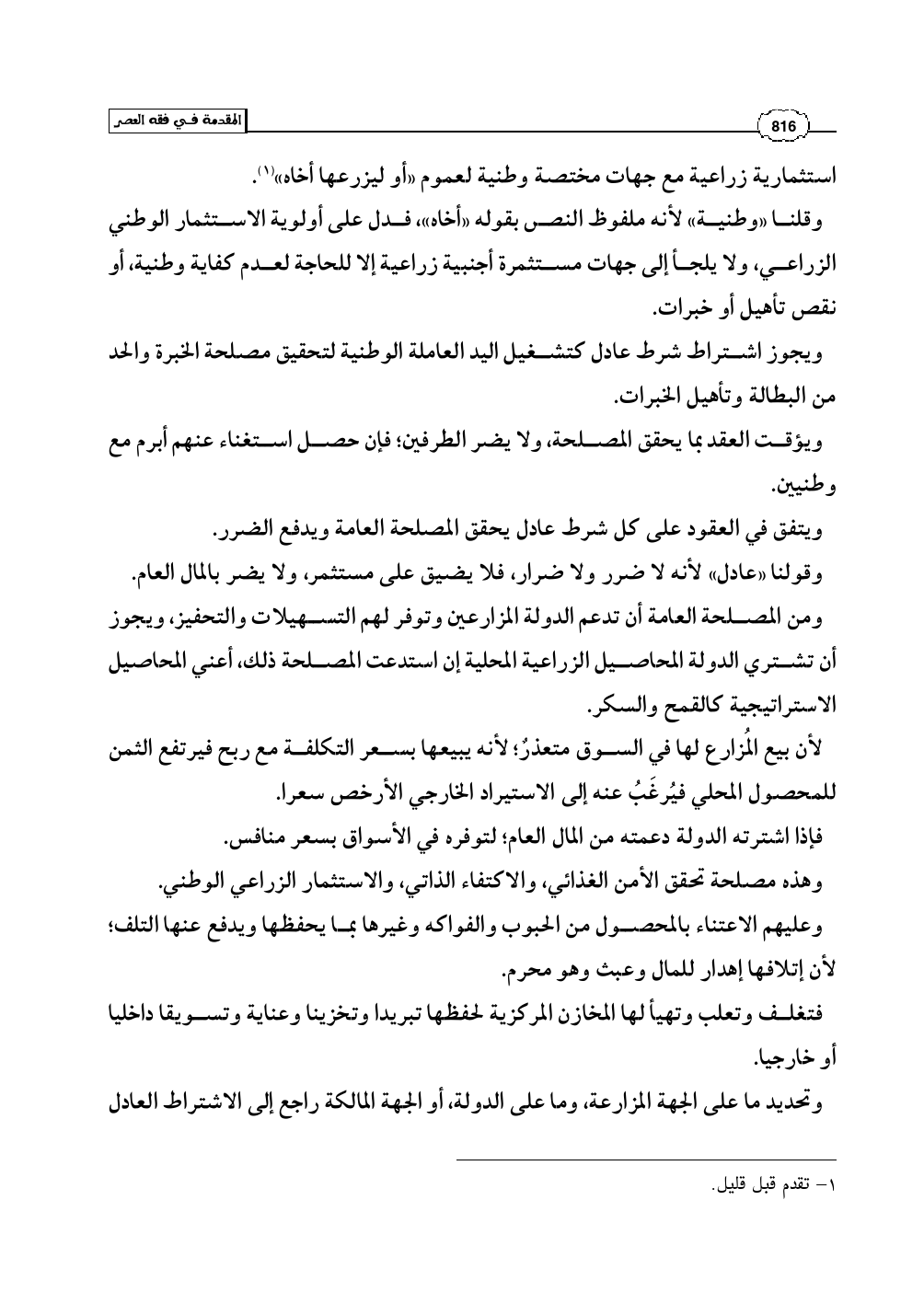 وقلنا «وطنية» لأنه ملفوظ النص بقوله «أخاه»، فدل على أولوية الاستثمار الوطني الزراعي، ولا يلجأ إلى جهات مستثمرة أجنبية زراعية إلا للحاجة لعدم كفاية وطنية، أو نقص تأهيل أو خبرات.