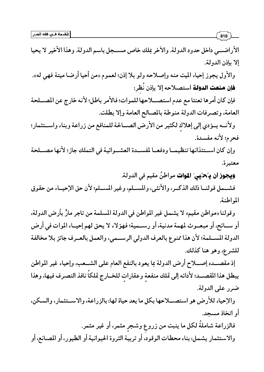 وقولنا «مواطن مقيم» لا يشمل غير المواطن في الدولة المسلمة من تاجر مارٍّ بأرض الدولة، أو سائح، أو مبعوث لمهمة مدنية، أو رسمية؛ فهؤلاء لا يحق لهم إحياء الموات في أرض الدولة المسلمة؛ لأن هذا ممنوع بالعرف الدولي الرسمي، والعمل بالعرف جائز بلا مخالفة للشرع، وهو هنا كذلك.