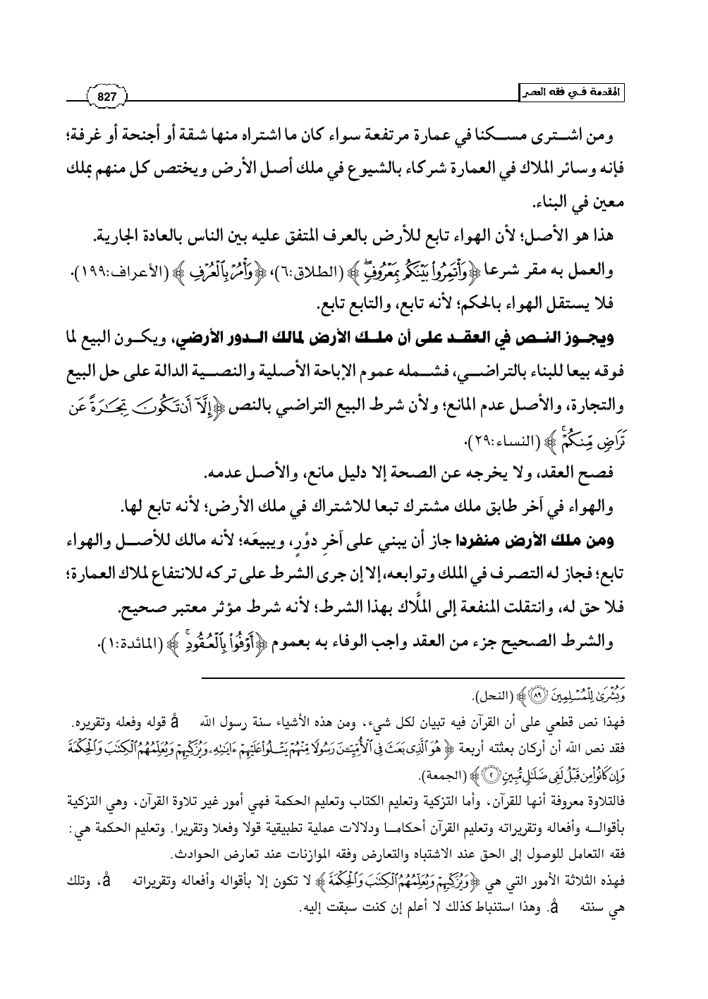 ويجوز النص في العقد على أن ملك الأرض لمالك الدور الأرضي، ويكون البيع لما فوقه بيعا للبناء بالتراضي، فشمله عموم الإباحة الأصلية والنصية الدالة على حل البيع والتجارة، والأصل عدم المانع؛ ولأن شرط البيع التراضي بالنص (إِلاَّ أَن تَكُونَ تِجَارَةً عَن تَرَاضٍ مِّنكُمْ) (النساء: 29).