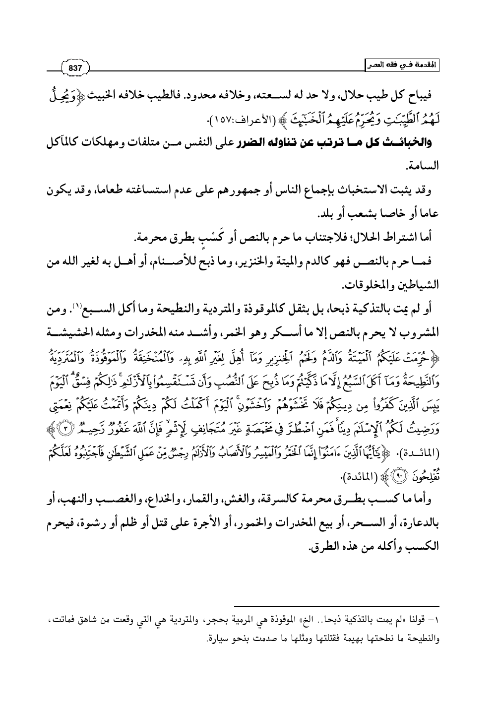 أو لم يمت بالتذكية ذبحا، بل بثقل كالموقوذة والمتردية والنطيحة وما أكل السبع (¬1). ومن المشروب لا يحرم بالنص إلا ما أسكر وهو الخمر، وأشد منه المخدرات ومثله الحشيشة (حُرِّمَتْ عَلَيْكُمُ الْمَيْتَةُ وَالْدَّمُ وَلَحْمُ الْخِنْزِيرِ وَمَا أُهِلَّ لِغَيْرِ اللَّهِ بِهِ وَالْمُنْخَنِقَةُ وَالْمَوْقُوذَةُ وَالْمُتَرَدِّيَةُ وَالنَّطِيحَةُ وَمَا أَكَلَ السَّبُعُ إِلاَّ مَا ذَكَّيْتُمْ وَمَا ذُبِحَ عَلَى النُّصُبِ وَأَن تَسْتَقْسِمُوا بِالأَزْلاَمِ ذَلِكُمْ فِسْقٌ الْيَوْمَ يَئِسَ الَّذِينَ كَفَرُوا مِن دِينِكُمْ فَلاَ تَخْشَوْهُمْ وَاخْشَوْنِ الْيَوْمَ أَكْمَلْتُ لَكُمْ دِينَكُمْ وَأَتْمَمْتُ عَلَيْكُمْ نِعْمَتِي وَرَضِيتُ لَكُمُ الإِسْلاَمَ دِينًا فَمَنِ اضْطُرَّ فِي مَخْمَصَةٍ غَيْرَ مُتَجَانِفٍ لِّإِثْمٍ فَإِنَّ اللَّهَ غَفُورٌ رَّحِيمٌ) (المائدة: 3). (يَا أَيُّهَا الَّذِينَ آمَنُوا إِنَّمَا الْخَمْرُ وَالْمَيْسِرُ وَالأَنصَابُ وَالأَزْلاَمُ رِجْسٌ مِّنْ عَمَلِ الشَّيْطَانِ فَاجْتَنِبُوهُ لَعَلَّكُمْ تُفْلِحُونَ) (المائدة: 90).