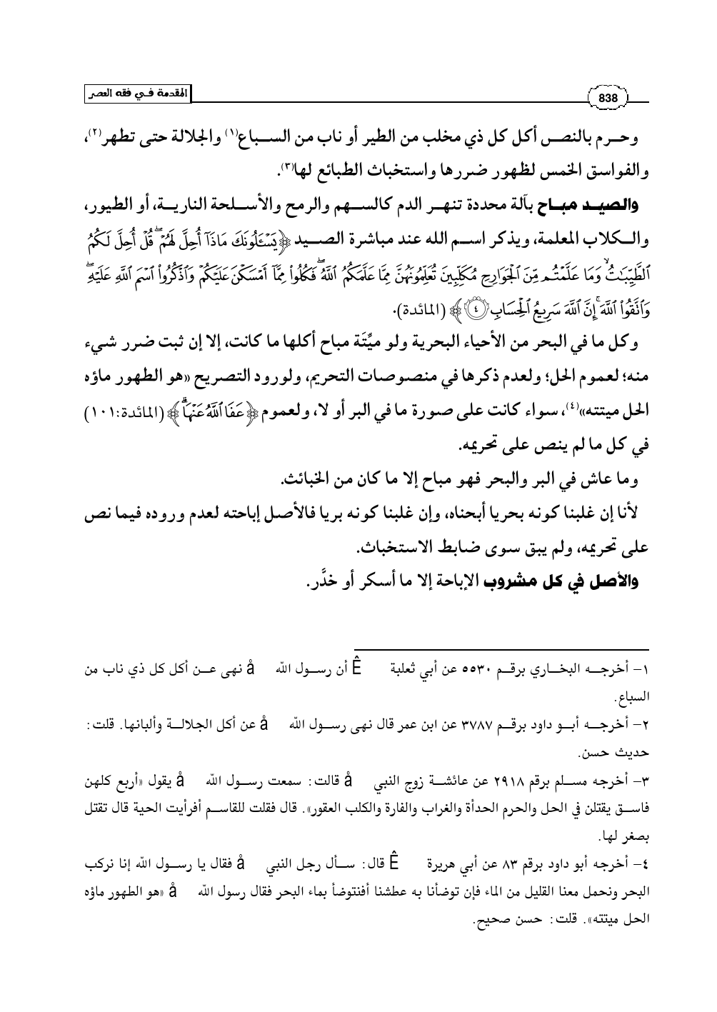 (¬4) - أخرجه أبو داود برقم 83 عن أبي هريرة رضي الله عنه قال: سأل رجل النبي صلى الله عليه وسلم فقال يا رسول الله إنا نركب البحر ونحمل معنا القليل من الماء فإن توضأنا به عطشنا أفنتوضأ بماء البحر فقال رسول الله صلى الله عليه وسلم «هو الطهور ماؤه الحل ميتته». قلت: حسن صحيح.
