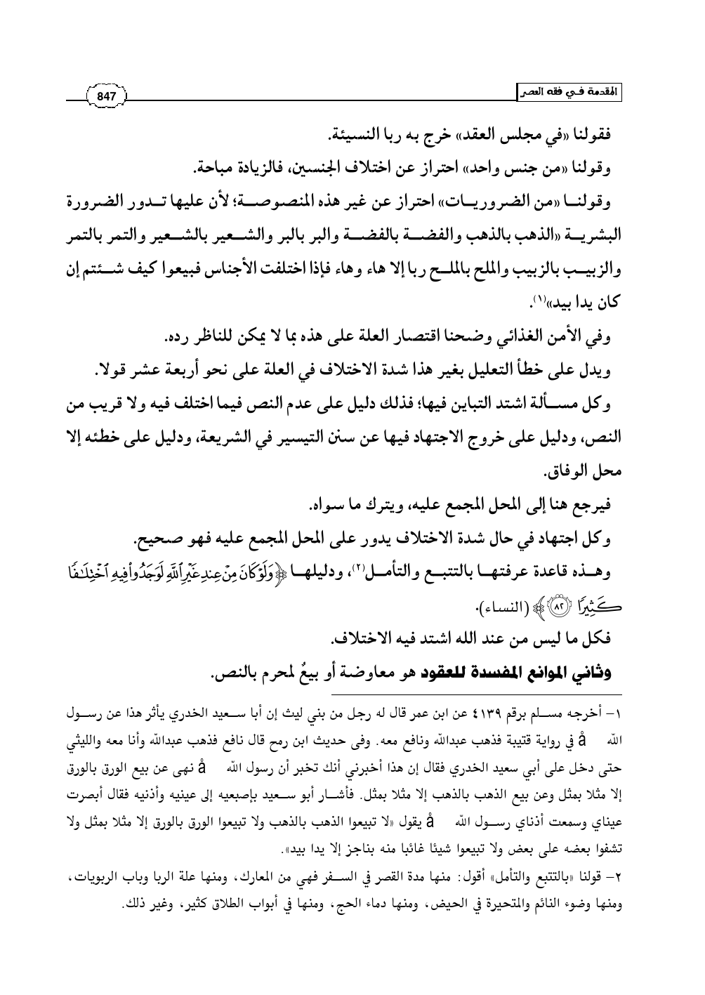 وقولنا «من الضروريات» احتراز عن غير هذه المنصوصة؛ لأن عليها تدور الضرورة البشرية «الذهب بالذهب والفضة بالفضة والبر بالبر والشعير بالشعير والتمر بالتمر والزبيب بالزبيب والملح بالملح ربا إلا هاء وهاء فإذا اختلفت الأجناس فبيعوا كيف شئتم إن كان يدا بيد» (¬1).