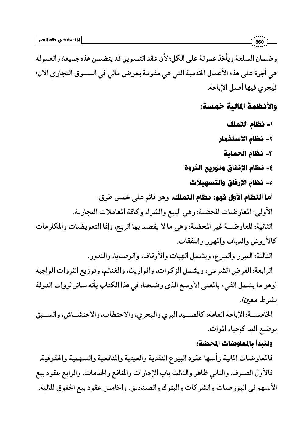 فالأول الصرف. والثاني ظاهر والثالث باب الإجارات والمنافع والخدمات. والرابع عقود بيع الأسهم في البورصات والشركات والبنوك والصناديق. والخامس عقود بيع الحقوق المالية.