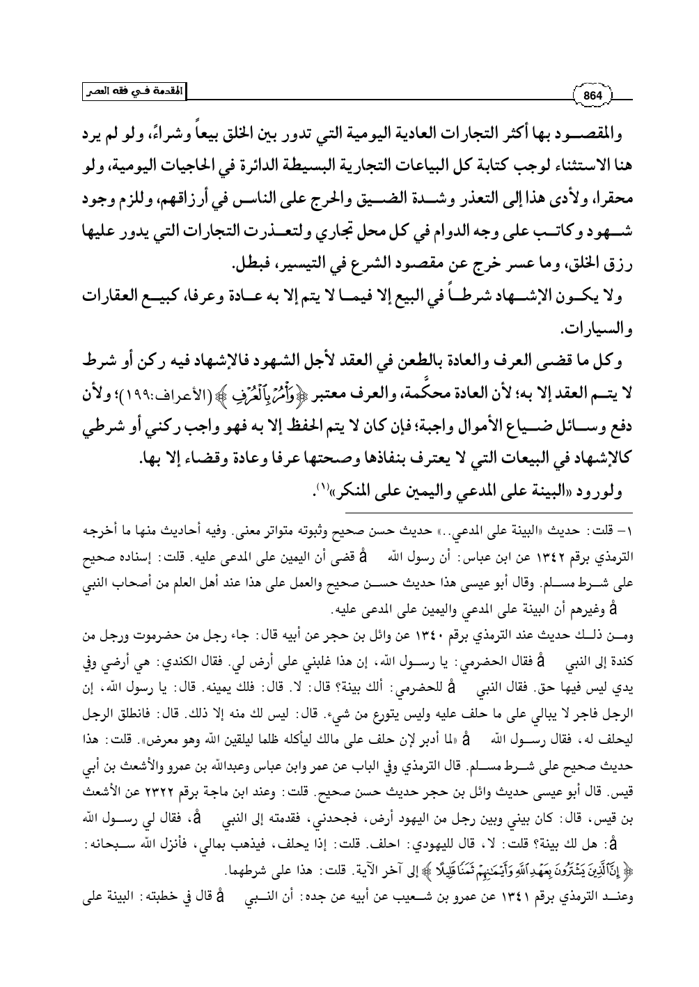 (¬1) - قلت: حديث «البينة على المدعي .. » حديث حسن صحيح وثبوته متواتر معنى. وفيه أحاديث منها ما أخرجه الترمذي برقم 1342 عن ابن عباس: أن رسول الله صلى الله عليه وسلم قضى أن اليمين على المدعى عليه. قلت: إسناده صحيح على شرط مسلم. وقال أبو عيسى هذا حديث حسن صحيح والعمل على هذا عند أهل العلم من أصحاب النبي صلى الله عليه وسلم وغيرهم أن البينة على المدعي واليمين على المدعى عليه.