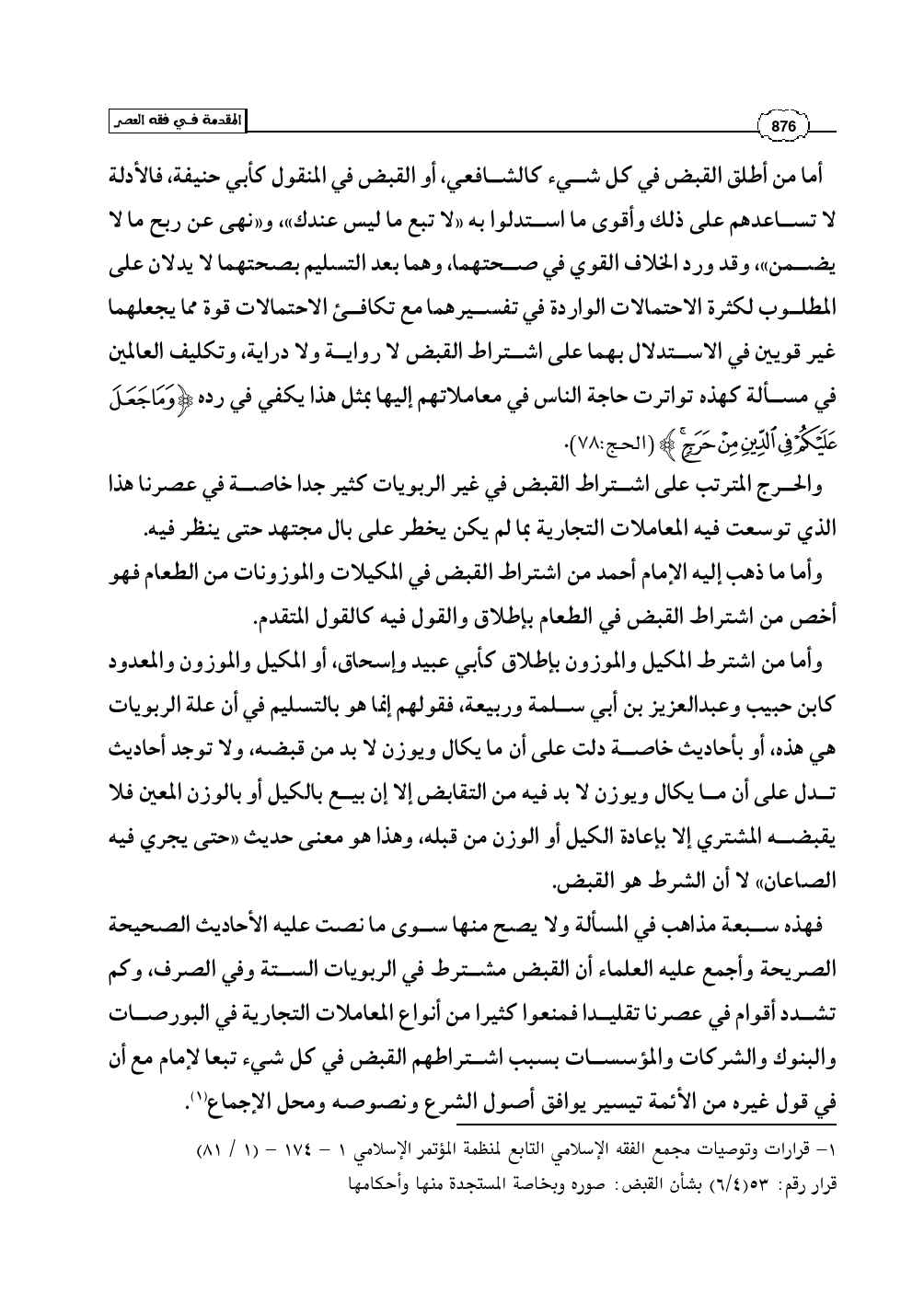 أما من أطلق القبض في كل شيء كالشافعي، أو القبض في المنقول كأبي حنيفة، فالأدلة لا تساعدهم على ذلك وأقوى ما استدلوا به «لا تبع ما ليس عندك»، و «نهى عن ربح ما لا يضمن»، وقد ورد الخلاف القوي في صحتهما، وهما بعد التسليم بصحتهما لا يدلان على المطلوب لكثرة الاحتمالات الواردة في تفسيرهما مع تكافئ الاحتمالات قوة مما يجعلهما غير قويين في الاستدلال بهما على اشتراط القبض لا رواية ولا دراية، وتكليف العالمين في مسألة كهذه تواترت حاجة الناس في معاملاتهم إليها بمثل هذا يكفي في رده (وَمَا جَعَلَ عَلَيْكُمْ فِي الدِّينِ مِنْ حَرَجٍ) (الحج: 78).
