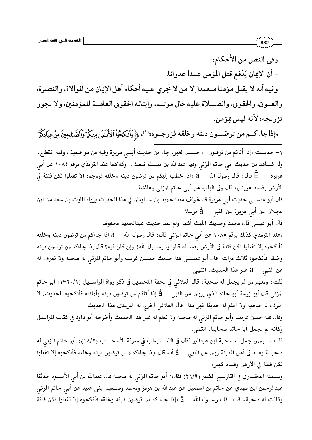 (¬1) - حديث «إذا أتاكم من ترضون .. » حسن لغيره جاء من حديث أبي هريرة وفيه من هو ضعيف وفيه انقطاع، وله شاهد من حديث أبي حاتم المزني وفيه عبدالله بن مسلم ضعيف. وكلاهما عند الترمذي برقم 1084 عن أبي هريرة رضي الله عنه قال: قال رسول الله صلى الله عليه وسلم «إذا خطب إليكم من ترضون دينه وخلقه فزوجوه إلا تفعلوا تكن فتنة في الأرض وفساد عريض» قال وفي الباب عن أبي حاتم المزني وعائشة.