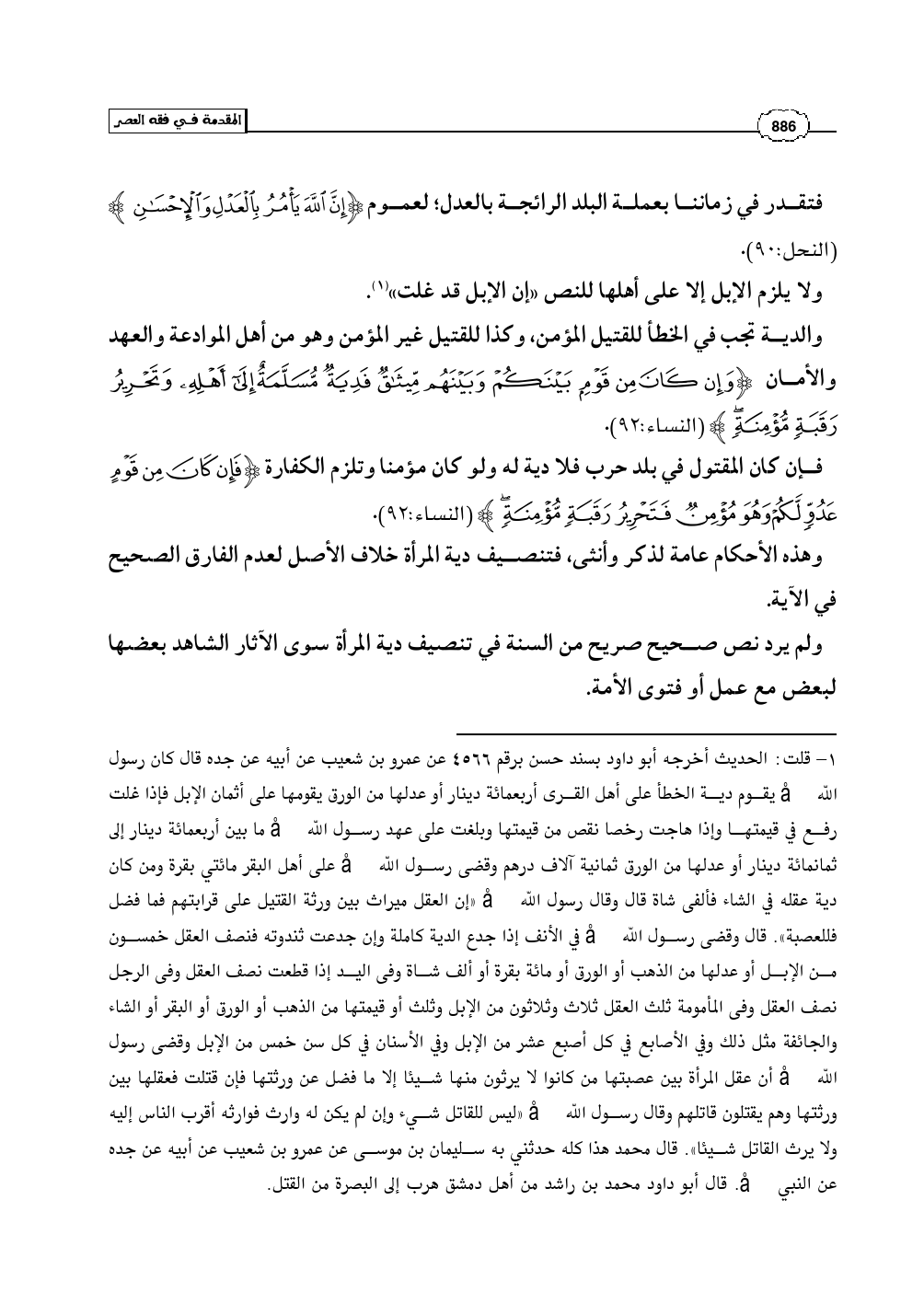 (¬1) - قلت: الحديث أخرجه أبو داود بسند حسن برقم 4566 عن عمرو بن شعيب عن أبيه عن جده قال كان رسول الله صلى الله عليه وسلم يقوم دية الخطأ على أهل القرى أربعمائة دينار أو عدلها من الورق يقومها على أثمان الإبل فإذا غلت رفع في قيمتها وإذا هاجت رخصا نقص من قيمتها وبلغت على عهد رسول الله صلى الله عليه وسلم ما بين أربعمائة دينار إلى ثمانمائة دينار أو عدلها من الورق ثمانية آلاف درهم وقضى رسول الله صلى الله عليه وسلم على أهل البقر مائتي بقرة ومن كان دية عقله في الشاء فألفى شاة قال وقال رسول الله صلى الله عليه وسلم «إن العقل ميراث بين ورثة القتيل على قرابتهم فما فضل فللعصبة». قال وقضى رسول الله صلى الله عليه وسلم في الأنف إذا جدع الدية كاملة وإن جدعت ثندوته فنصف العقل خمسون من الإبل أو عدلها من الذهب أو الورق أو مائة بقرة أو ألف شاة وفى اليد إذا قطعت نصف العقل وفى الرجل نصف العقل وفى المأمومة ثلث العقل ثلاث وثلاثون من الإبل وثلث أو قيمتها من الذهب أو الورق أو البقر أو الشاء والجائفة مثل ذلك وفي الأصابع في كل أصبع عشر من الإبل وفي الأسنان في كل سن خمس من الإبل وقضى رسول الله صلى الله عليه وسلم أن عقل المرأة بين عصبتها من كانوا لا يرثون منها شيئا إلا ما فضل عن ورثتها فإن قتلت فعقلها بين ورثتها وهم يقتلون قاتلهم وقال رسول الله صلى الله عليه وسلم «ليس للقاتل شيء وإن لم يكن له وارث فوارثه أقرب الناس إليه ولا يرث القاتل شيئا». قال محمد هذا كله حدثني به سليمان بن موسى عن عمرو بن شعيب عن أبيه عن جده عن النبي صلى الله عليه وسلم .. قال أبو داود محمد بن راشد من أهل دمشق هرب إلى البصرة من القتل.