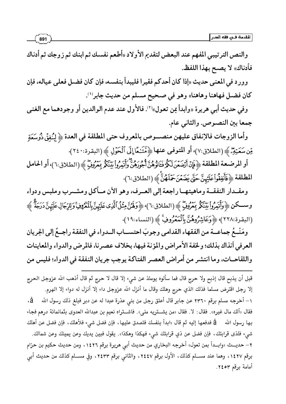 وفي حديث أبي هريرة «وابدأ بمن تعول» (¬2). فالأول عند عدم الوالدين أو وجودهما مع الغنى جمعا بين النصوص. والثاني عام.