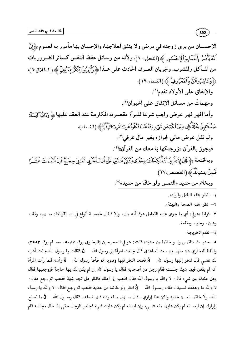 (¬5) - حديث «التمس ولو خاتما من حديد» قلت: هو في الصحيحين (البخاري برقم 5087، مسلم برقم 3553) واللفظ للبخاري عن سهل بن سعد الساعدي قال جاءت امرأة إلى رسول الله صلى الله عليه وسلم فقالت يا رسول الله جئت أهب لك نفسي قال فنظر إليها رسول الله صلى الله عليه وسلم فصعد النظر فيها وصوبه ثم طأطأ رسول الله صلى الله عليه وسلم رأسه فلما رأت المرأة أنه لم يقض فيها شيئا جلست فقام رجل من أصحابه فقال يا رسول الله إن لم يكن لك بها حاجة فزوجنيها فقال وهل عندك من شيء قال: لا والله يا رسول الله فقال اذهب إلى أهلك فانظر هل تجد شيئا فذهب ثم رجع فقال: لا والله ما وجدت شيئا، فقال رسول الله صلى الله عليه وسلم انظر ولو خاتما من حديد فذهب ثم رجع فقال: لا والله يا رسول الله، ولا خاتما من حديد ولكن هذا إزاري- قال سهل ما له رداء فلها نصفه، فقال رسول الله صلى الله عليه وسلم ما تصنع بإزارك إن لبسته لم يكن عليها منه شيء وإن لبسته لم يكن عليك شيء فجلس الرجل حتى إذا طال مجلسه قام فرآه رسول الله صلى الله عليه وسلم موليا فأمر به فدعي فلما جاء قال ماذا معك من القرآن قال معي سورة كذا وسورة كذا عددها فقال تقرؤهن عن ظهر قلبك قال نعم قال اذهب فقد ملكتكها بما معك من القرآن.