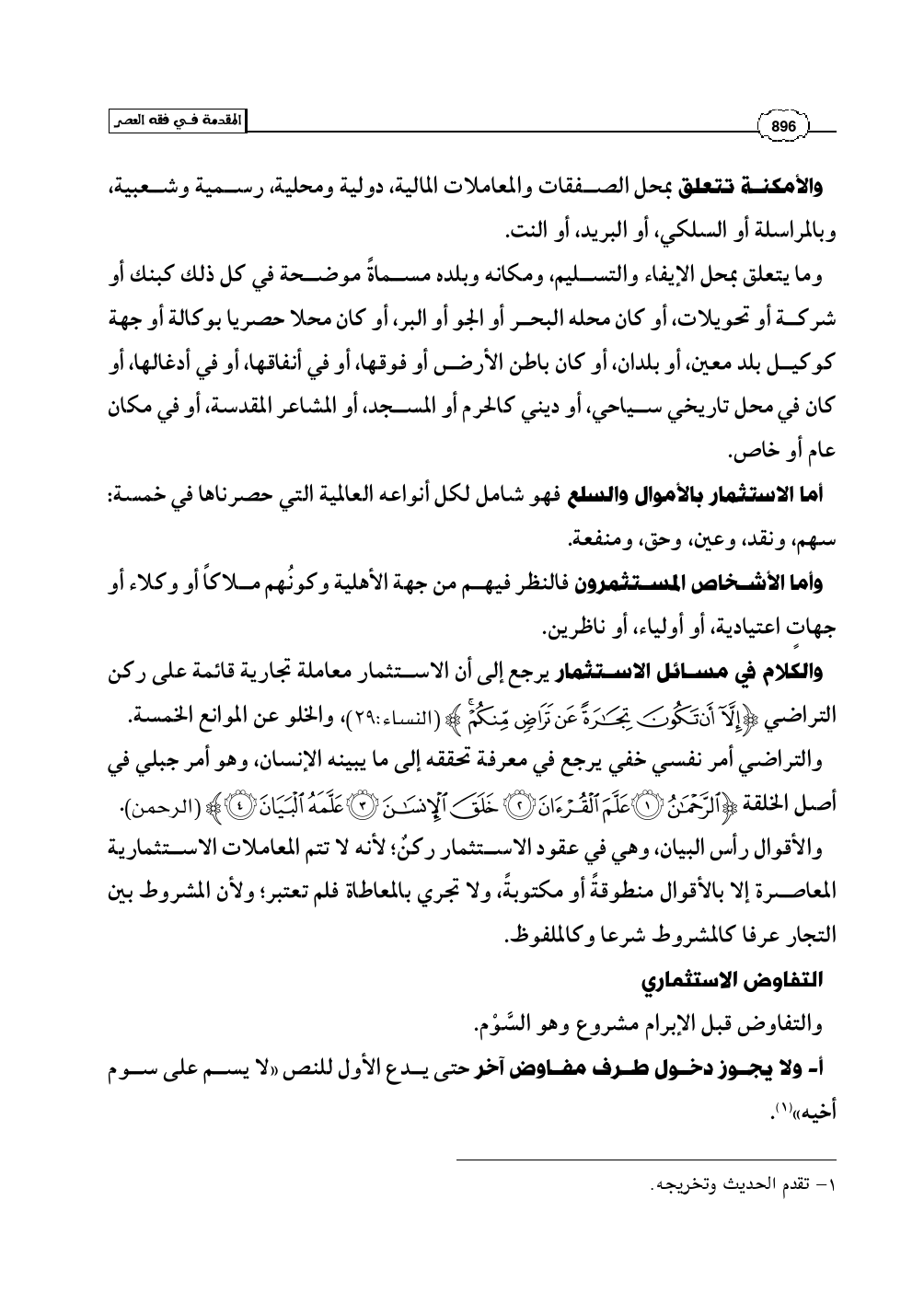 والكلام في مسائل الاستثمار يرجع إلى أن الاستثمار معاملة تجارية قائمة على ركن التراضي (إِلاَّ أَن تَكُونَ تِجَارَةً عَن تَرَاضٍ مِّنكُمْ) (النساء: 29)، والخلو عن الموانع الخمسة.