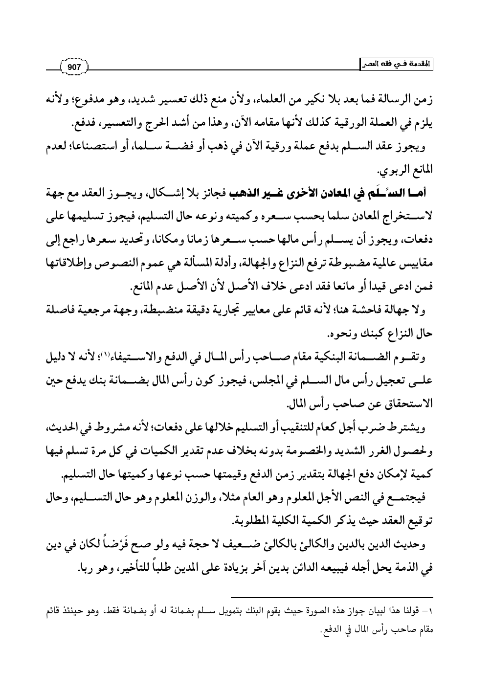 أما السَّلَم في المعادن الأخرى غير الذهب فجائز بلا إشكال، ويجوز العقد مع جهة لاستخراج المعادن سلما بحسب سعره وكميته ونوعه حال التسليم، فيجوز تسليمها على دفعات، ويجوز أن يسلم رأس مالها حسب سعرها زمانا ومكانا، وتحديد سعرها راجع إلى مقاييس عالمية مضبوطة ترفع النزاع والجهالة، وأدلة المسألة هي عموم النصوص وإطلاقاتها فمن ادعى قيدا أو مانعا فقد ادعى خلاف الأصل لأن الأصل عدم المانع.