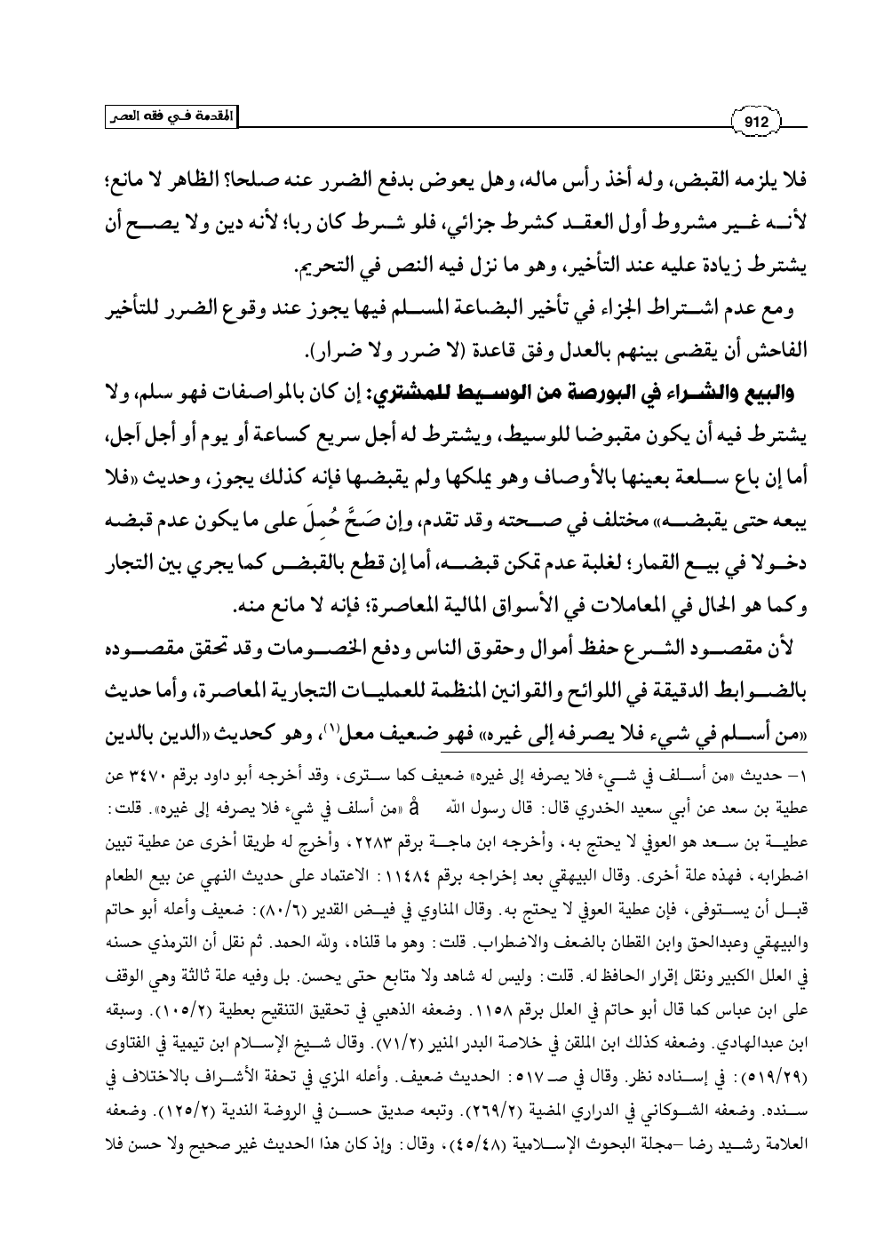 (¬1) - حديث «من أسلف في شيء فلا يصرفه إلى غيره» ضعيف كما سترى، وقد أخرجه أبو داود برقم 3470 عن عطية بن سعد عن أبي سعيد الخدري قال: قال رسول الله صلى الله عليه وسلم «من أسلف في شيء فلا يصرفه إلى غيره». قلت: عطية بن سعد هو العوفي لا يحتج به، وأخرجه ابن ماجة برقم 2283، وأخرج له طريقا أخرى عن عطية تبين اضطرابه، فهذه علة أخرى. وقال البيهقي بعد إخراجه برقم 11484: الاعتماد على حديث النهي عن بيع الطعام قبل أن يستوفى، فإن عطية العوفي لا يحتج به. وقال المناوي في فيض القدير (6/ 80): ضعيف وأعله أبو حاتم والبيهقي وعبدالحق وابن القطان بالضعف والاضطراب. قلت: وهو ما قلناه، ولله الحمد. ثم نقل أن الترمذي حسنه في العلل الكبير ونقل إقرار الحافظ له. قلت: وليس له شاهد ولا متابع حتى يحسن. بل وفيه علة ثالثة وهي الوقف على ابن عباس كما قال أبو حاتم في العلل برقم 1158. وضعفه الذهبي في تحقيق التنقيح بعطية (2/ 105). وسبقه ابن عبدالهادي. وضعفه كذلك ابن الملقن في خلاصة البدر المنير (2/ 71). وقال شيخ الإسلام ابن تيمية في الفتاوى (29/ 519): في إسناده نظر. وقال في صـ 517: الحديث ضعيف. وأعله المزي في تحفة الأشراف بالاختلاف في سنده. وضعفه الشوكاني في الدراري المضية (2/ 269). وتبعه صديق حسن في الروضة الندية (2/ 125). وضعفه العلامة رشيد رضا -مجلة البحوث الإسلامية (48/ 45)، وقال: وإذ كان هذا الحديث غير صحيح ولا حسن فلا =