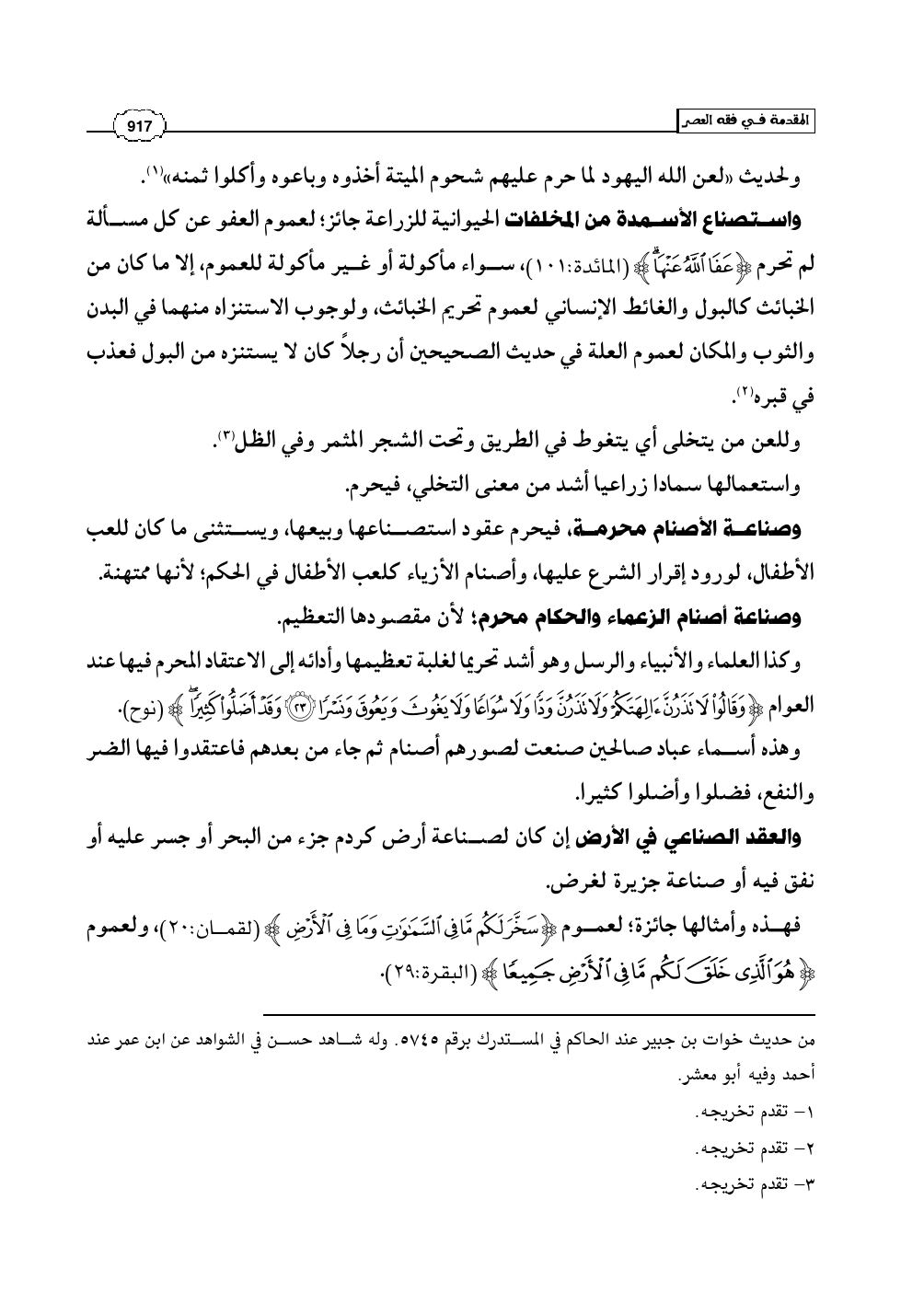 واستصناع الأسمدة من المخلفات الحيوانية للزراعة جائز؛ لعموم العفو عن كل مسألة لم تحرم (عَفَا اللَّهُ عَنْهَا) (المائدة: 101)، سواء مأكولة أو غير مأكولة للعموم، إلا ما كان من الخبائث كالبول والغائط الإنساني لعموم تحريم الخبائث، ولوجوب الاستنزاه منهما في البدن والثوب والمكان لعموم العلة في حديث الصحيحين أن رجلاً كان لا يستنزه من البول فعذب في قبره (¬2).