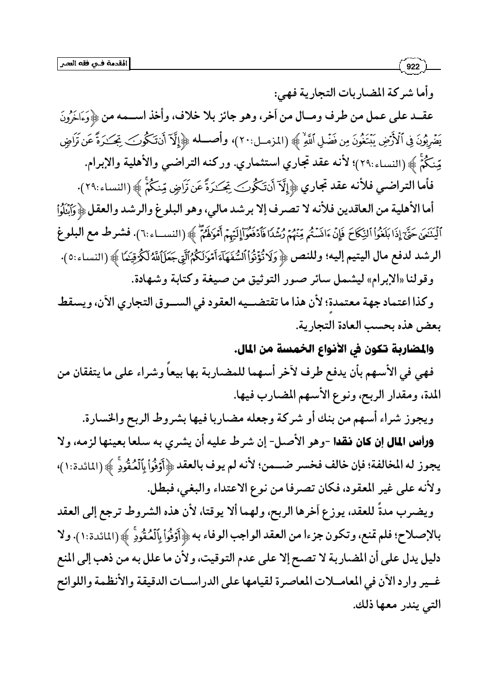 عقد على عمل من طرف ومال من آخر، وهو جائز بلا خلاف، وأخذ اسمه من (وَآخَرُونَ يَضْرِبُونَ فِي الأَرْضِ يَبْتَغُونَ مِن فَضْلِ اللَّهِ) (المزمل: 20)، وأصله (إِلاَّ أَن تَكُونَ تِجَارَةً عَن تَرَاضٍ مِّنكُمْ) (النساء: 29)؛ لأنه عقد تجاري استثماري. وركنه التراضي والأهلية والإبرام.