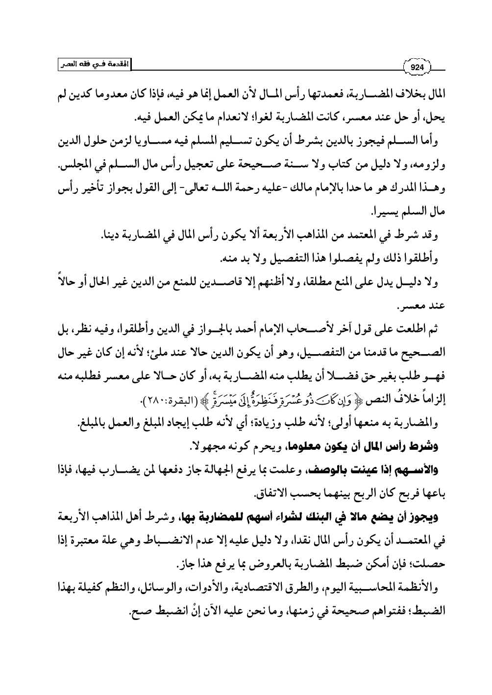 ثم اطلعت على قول آخر لأصحاب الإمام أحمد بالجواز في الدين وأطلقوا، وفيه نظر، بل الصحيح ما قدمنا من التفصيل، وهو أن يكون الدين حالا عند ملئ؛ لأنه إن كان غير حال فهو طلب بغير حق فضلا أن يطلب منه المضاربة به، أو كان حالا على معسر فطلبه منه إلزاماً خلافُ النص (وَإِن كَانَ ذُو عُسْرَةٍ فَنَظِرَةٌ إِلَى مَيْسَرَةٍ) (البقرة: 280).