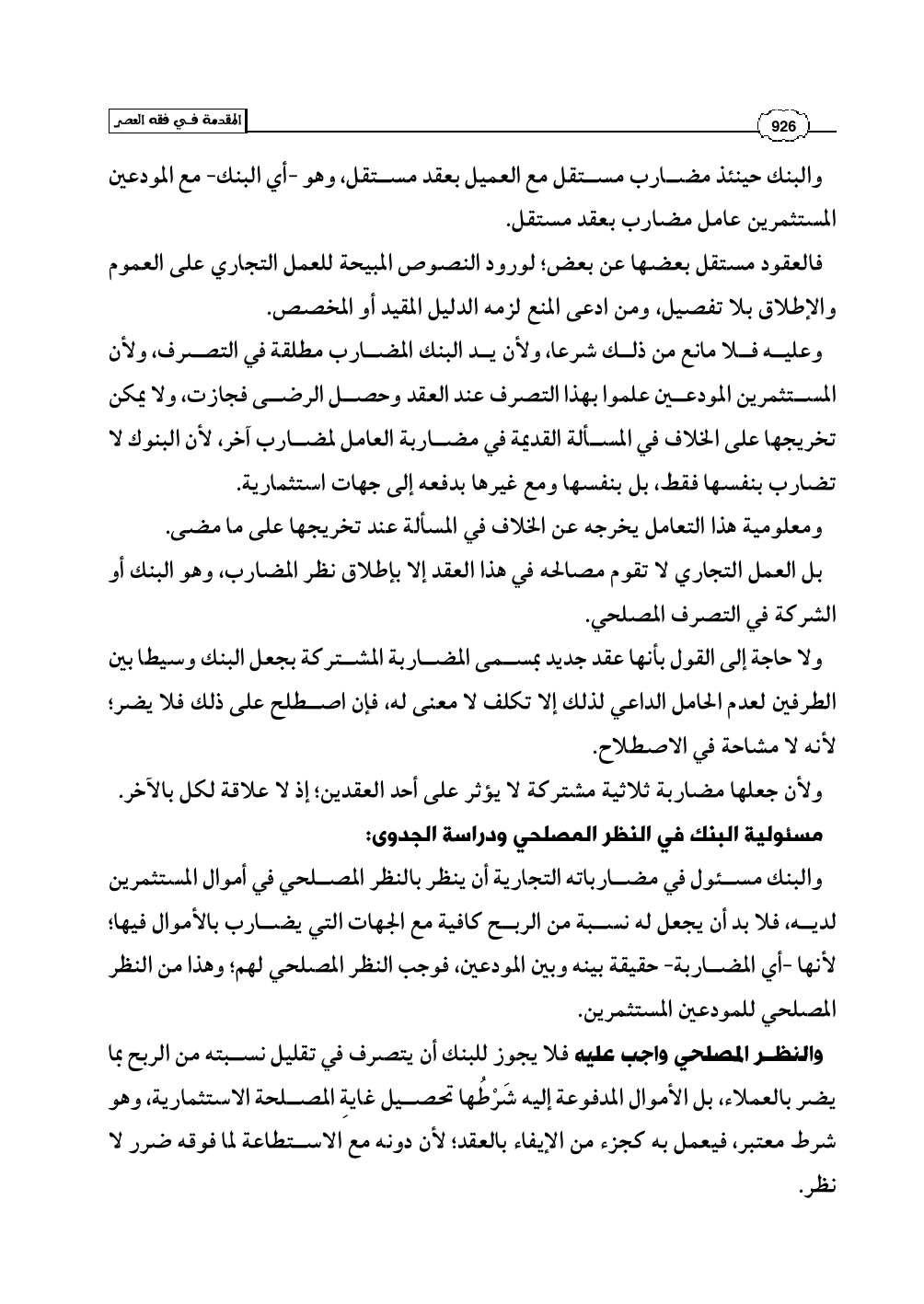 بل العمل التجاري لا تقوم مصالحه في هذا العقد إلا بإطلاق نظر المضارب، وهو البنك أو الشركة في التصرف المصلحي.