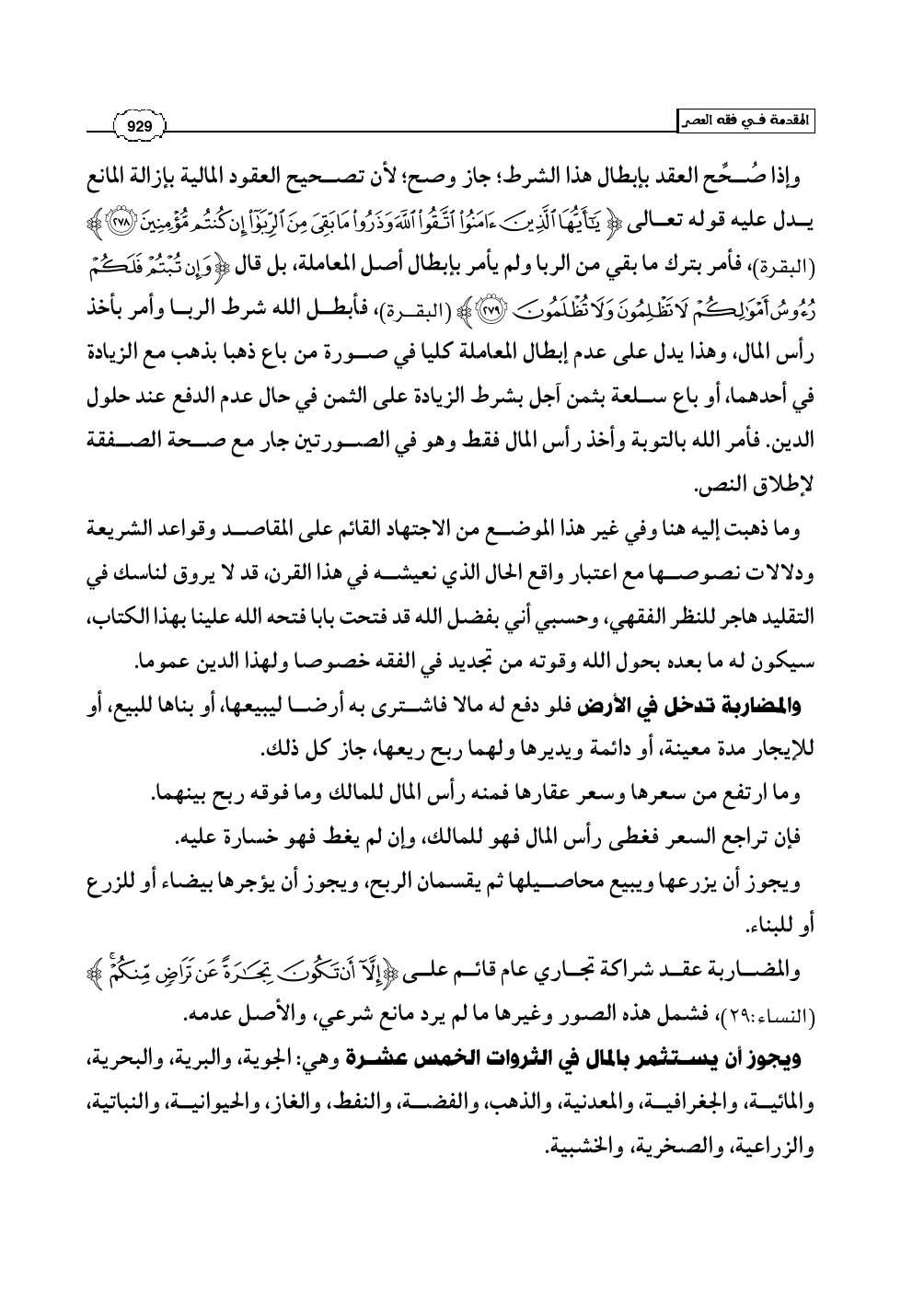 وإذا صُحِّح العقد بإبطال هذا الشرط؛ جاز وصح؛ لأن تصحيح العقود المالية بإزالة المانع يدل عليه قوله تعالى (يَا أَيُّهَا الَّذِينَ آمَنُوا اتَّقُوا اللَّهَ وَذَرُوا مَا بَقِيَ مِنَ الرِّبَا إِن كُنتُم مُّؤْمِنِينَ) (البقرة: 278)، فأمر بترك ما بقي من الربا ولم يأمر بإبطال أصل المعاملة، بل قال (وَإِن تُبْتُمْ فَلَكُمْ رُؤُوسُ أَمْوَالِكُمْ لاَ تَظْلِمُونَ وَلاَ تُظْلَمُونَ) (البقرة: 279)، فأبطل الله شرط الربا وأمر بأخذ رأس المال، وهذا يدل على عدم إبطال المعاملة كليا في صورة من باع ذهبا بذهب مع الزيادة في أحدهما، أو باع سلعة بثمن آجل بشرط الزيادة على الثمن في حال عدم الدفع عند حلول الدين. فأمر الله بالتوبة وأخذ رأس المال فقط وهو في الصورتين جار مع صحة الصفقة لإطلاق النص.