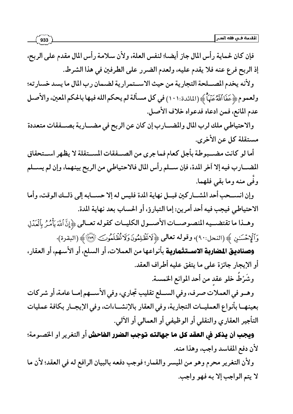 ولأنه يخدم المصلحة التجارية من حيث الاستمرارية لضمان رب المال ما يسد خسارته؛ ولعموم (عَفَا اللَّهُ عَنْهَا) (المائدة: 101) في كل مسألة لم يحكم الله فيها بالحكم المعين، والأصل عدم المانع، فمن ادعاه فدعواه خلاف الأصل.