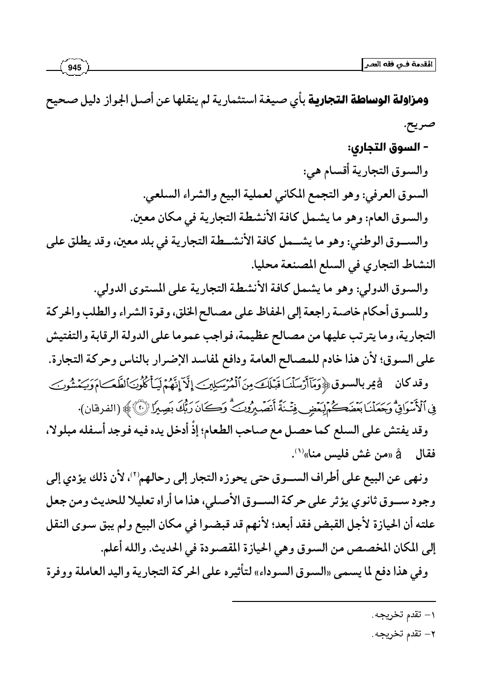 ونهى عن البيع على أطراف السوق حتى يحوزه التجار إلى رحالهم (¬2)، لأن ذلك يؤدي إلى وجود سوق ثانوي يؤثر على حركة السوق الأصلي، هذا ما أراه تعليلا للحديث ومن جعل علته أن الحيازة لأجل القبض فقد أبعد؛ لأنهم قد قبضوا في مكان البيع ولم يبق سوى النقل إلى المكان المخصص من السوق وهي الحيازة المقصودة في الحديث. والله أعلم.