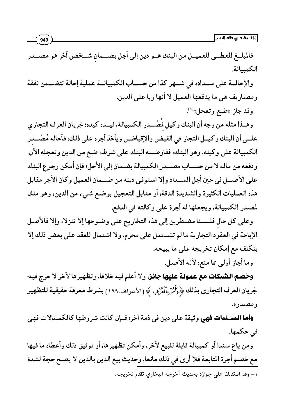 وهذا مثله من وجه أن البنك وكيل لِمُصْدر الكمبيالة، فيده كيده؛ لجريان العرف التجاري على أن البنك وكيل التجار في القبض والإقباض ويأخذ أجره على ذلك، فأحاله مُصْدِر الكمبيالة على وكيله، وهو البنك، ففاوضه البنك على شرط: ضع من الدين وتعجله الآن. ودفعه من ماله لا من حساب مصدر الكمبيالة بضمان إلى الأجل؛ فإن أمكن رجوع البنك على الأصل في حين أجل السداد وإلا استوفى دينه من ضمان العميل وكان الأجر مقابل هذه العمليات الكثيرة والشديدة الدقة، أو مقابل التعجيل بوضع شيء من الدين، وهو ملك لمصدر الكمبيالة، ويجعلها له أجرة على وكالته في الدفع.
