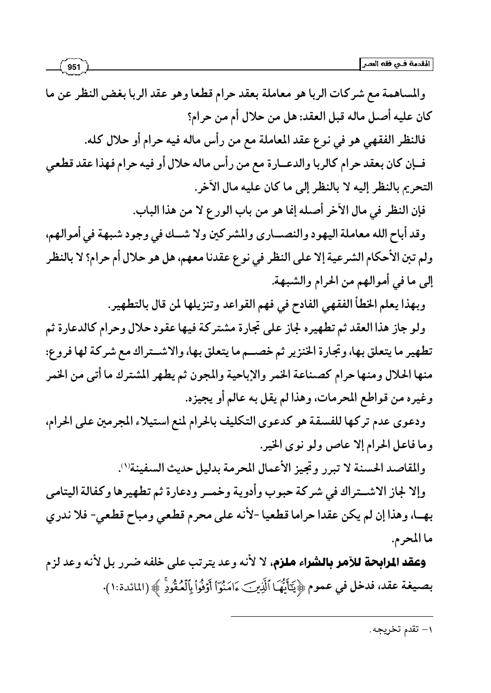 ولو جاز هذا العقد ثم تطهيره لجاز على تجارة مشتركة فيها عقود حلال وحرام كالدعارة ثم تطهير ما يتعلق بها، وتجارة الخنزير ثم خصم ما يتعلق بها، والاشتراك مع شركة لها فروع: منها الحلال ومنها حرام كصناعة الخمر والإباحية والمجون ثم يطهر المشترك ما أتى من الخمر وغيره من قواطع المحرمات، وهذا لم يقل به عالم أو يجيزه.