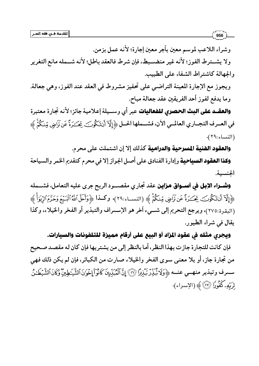 وشراء الإبل في أسواق مزاين عقد تجاري مقصود الربح جرى عليه التعامل، فشمله (إِلاَّ أَن تَكُونَ تِجَارَةً عَن تَرَاضٍ مِّنكُمْ) (النساء: 29)، وكذا (وَأَحَلَّ اللَّهُ الْبَيْعَ وَحَرَّمَ الرِّبَا) (البقرة: 275)، ويرجع التحريم إلى شيء آخر هو الإسراف والتبذير أو الفخر والخيلاء، وكذا يقال في شراء الطيور.