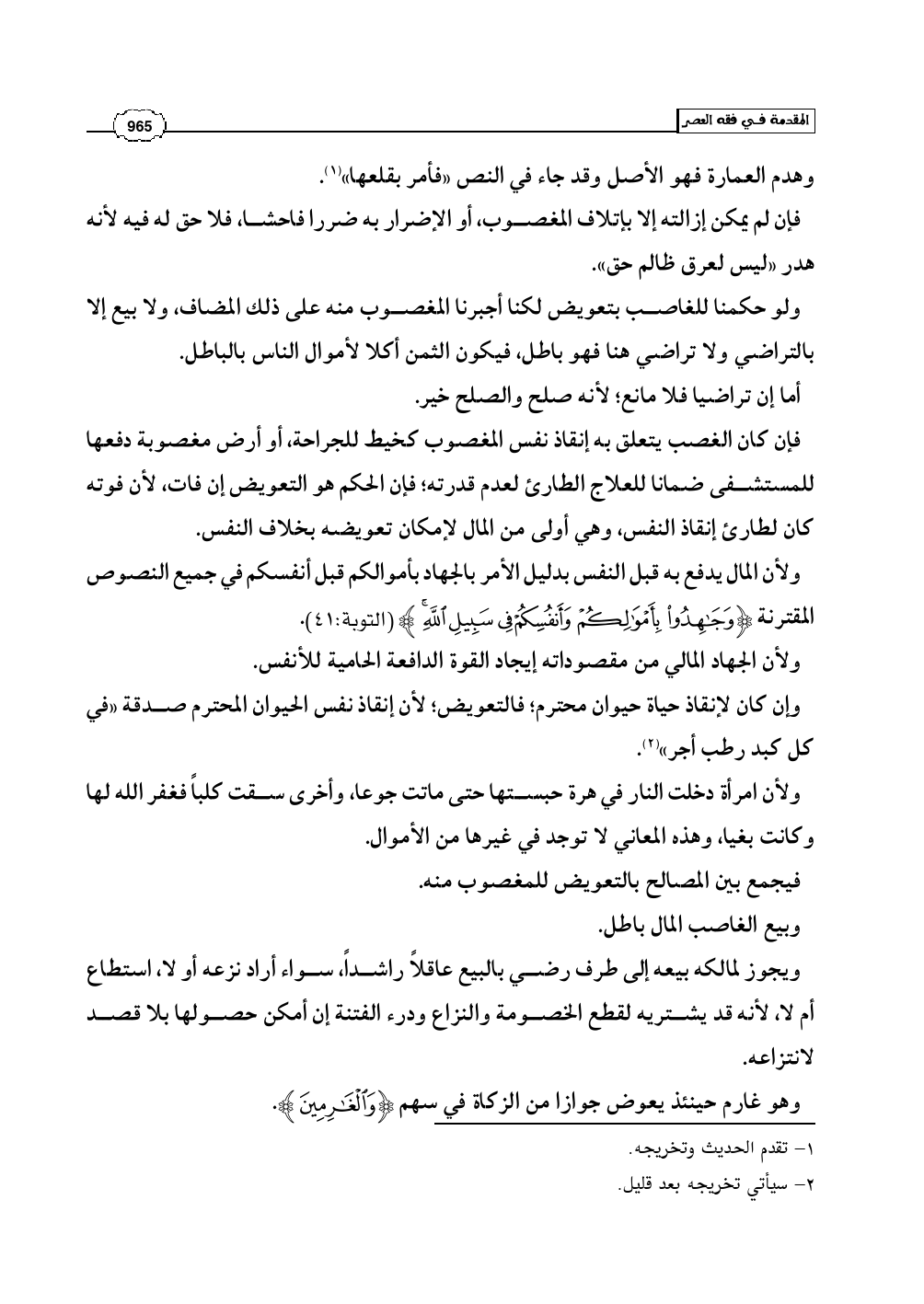 ولو حكمنا للغاصب بتعويض لكنا أجبرنا المغصوب منه على ذلك المضاف، ولا بيع إلا بالتراضي ولا تراضي هنا فهو باطل، فيكون الثمن أكلا لأموال الناس بالباطل.