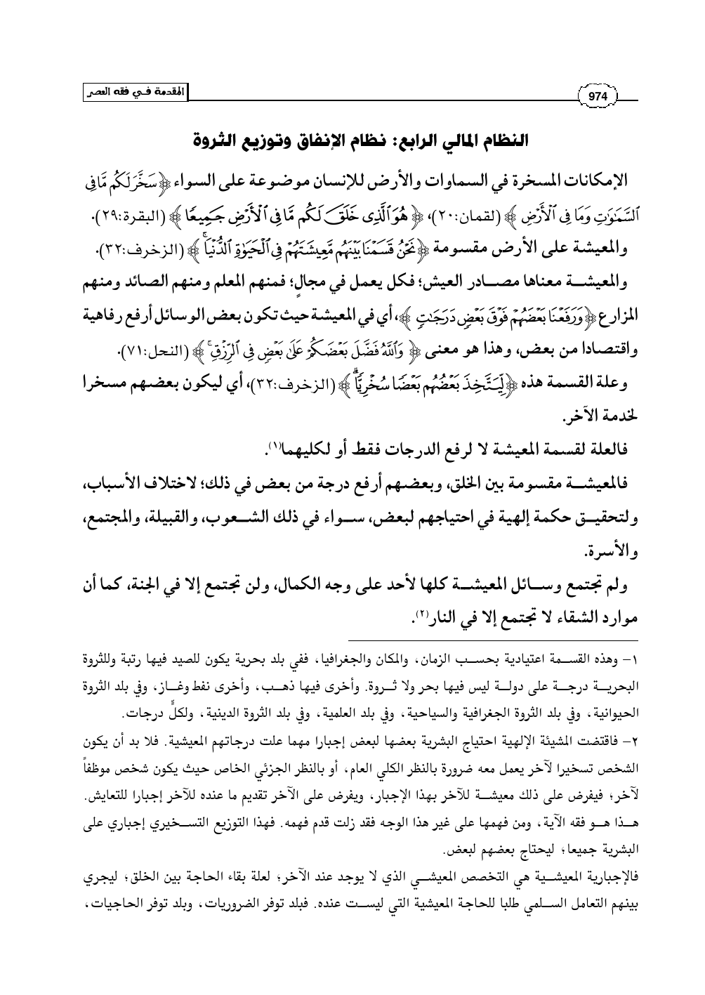 (¬2) - فاقتضت المشيئة الإلهية احتياج البشرية بعضها لبعض إجبارا مهما علت درجاتهم المعيشية. فلا بد أن يكون الشخص تسخيرا لآخر يعمل معه ضرورة بالنظر الكلي العام، أو بالنظر الجزئي الخاص حيث يكون شخص موظفاً لآخر؛ فيفرض على ذلك معيشة للآخر بهذا الإجبار، ويفرض على الآخر تقديم ما عنده للآخر إجبارا للتعايش. هذا هو فقه الآية، ومن فهمها على غير هذا الوجه فقد زلت قدم فهمه. فهذا التوزيع التسخيري إجباري على البشرية جميعا؛ ليحتاج بعضهم لبعض.