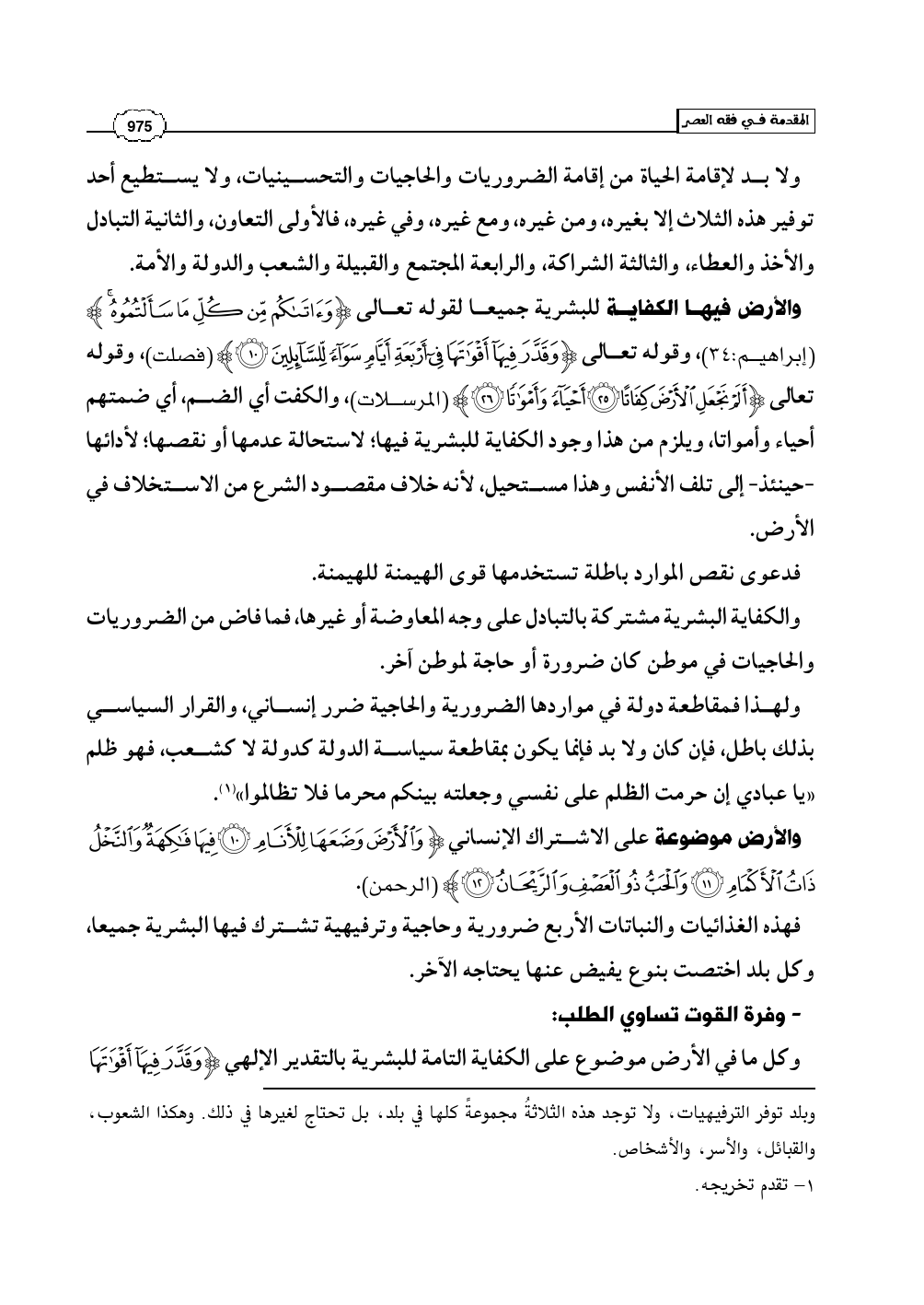 والأرض فيها الكفاية للبشرية جميعا لقوله تعالى (وَآتَاكُم مِّن كُلِّ مَا سَأَلْتُمُوهُ) (إبراهيم: 34)، وقوله تعالى (وَقَدَّرَ فِيهَا أَقْوَاتَهَا فِي أَرْبَعَةِ أَيَّامٍ سَوَاء لِّلسَّائِلِينَ) (فصلت: 10)، وقوله تعالى (أَلَمْ نَجْعَلِ الأَرْضَ كِفَاتًا* أَحْيَاء وَأَمْوَاتًا) (المرسلات: 25 - 26)، والكفت أي الضم، أي ضمتهم أحياء وأمواتا، ويلزم من هذا وجود الكفاية للبشرية فيها؛ لاستحالة عدمها أو نقصها؛ لأدائها -حينئذ- إلى تلف الأنفس وهذا مستحيل، لأنه خلاف مقصود الشرع من الاستخلاف في الأرض.