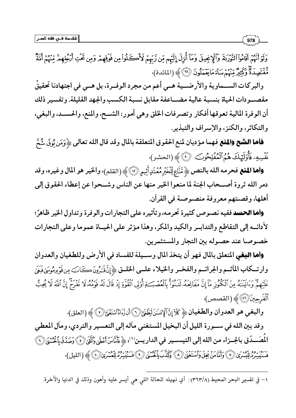 وأما المنع فحرمه الله بالنص (مَنَّاعٍ لِّلْخَيْرِ مُعْتَدٍ أَثِيمٍ) (القلم: 12)، والخير هو المال وغيره، وقد دمر الله ثروة أصحاب الجنة لما منعوا الخير منها عن الناس وشحوا عن إعطاء الحقوق إلى أهلها، وقصتهم معروفة منصوصة في القرآن.