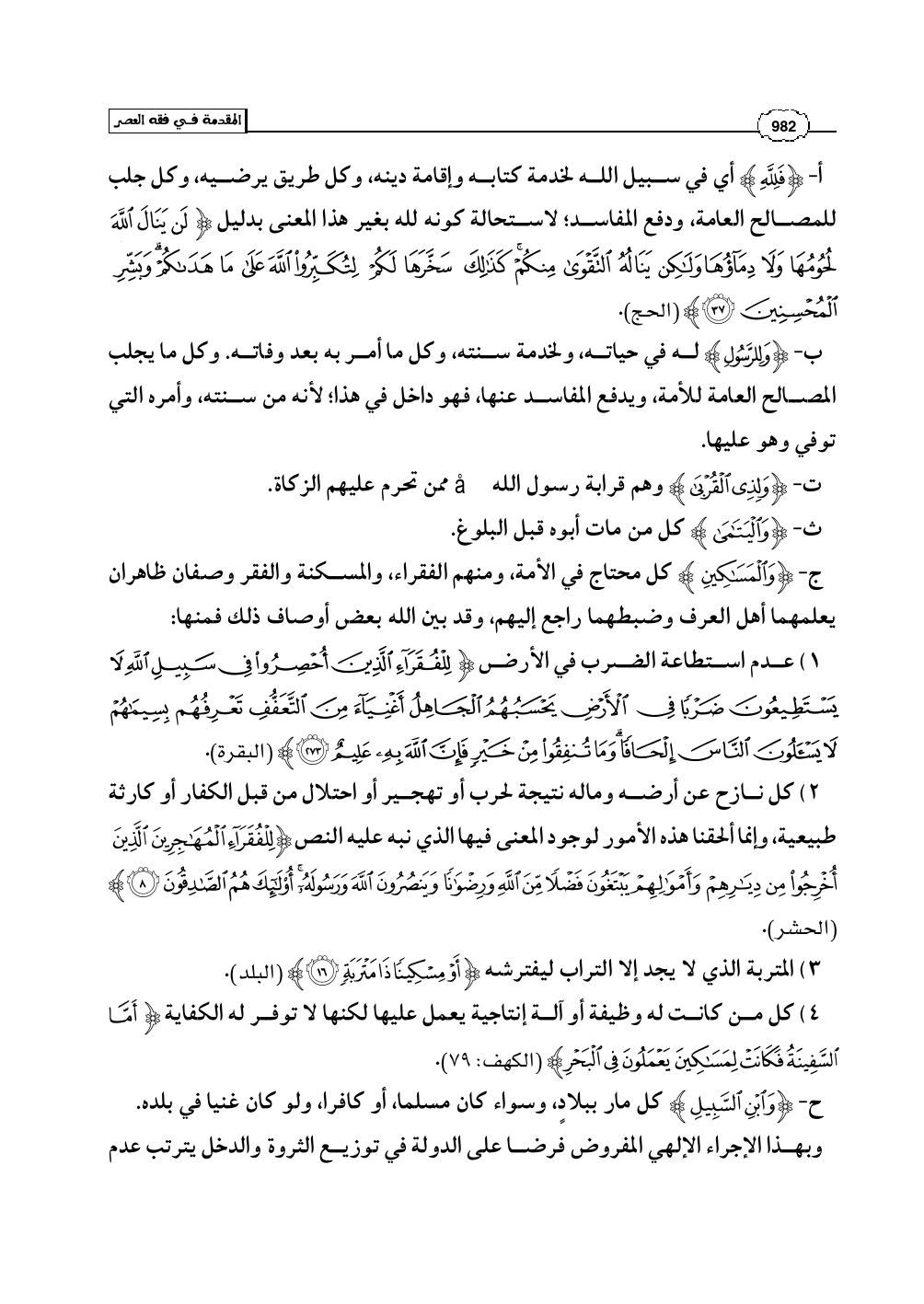 ج- (وَالْمَسَاكِينِ) كل محتاج في الأمة، ومنهم الفقراء، والمسكنة والفقر وصفان ظاهران يعلمهما أهل العرف وضبطهما راجع إليهم، وقد بين الله بعض أوصاف ذلك فمنها: