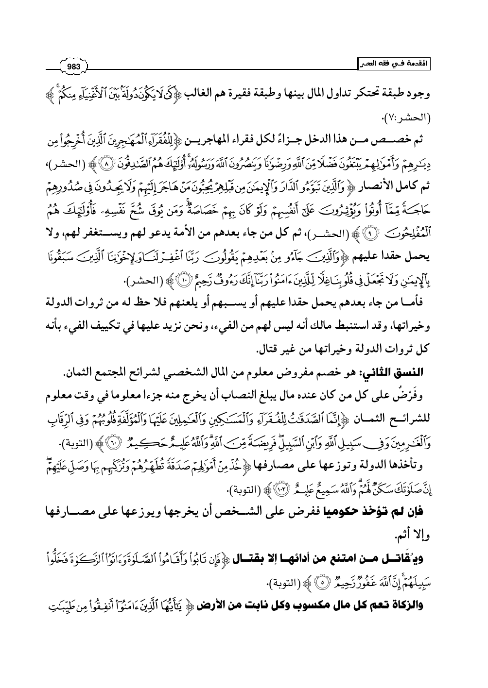 وفَرْضٌ على كل من كان عنده مال يبلغ النصاب أن يخرج منه جزءا معلوما في وقت معلوم للشرائح الثمان (إِنَّمَا الصَّدَقَاتُ لِلْفُقَرَاء وَالْمَسَاكِينِ وَالْعَامِلِينَ عَلَيْهَا وَالْمُؤَلَّفَةِ قُلُوبُهُمْ وَفِي الرِّقَابِ وَالْغَارِمِينَ وَفِي سَبِيلِ اللَّهِ وَابْنِ السَّبِيلِ فَرِيضَةً مِّنَ اللَّهِ وَاللَّهُ عَلِيمٌ حَكِيمٌ) (التوبة: 60).