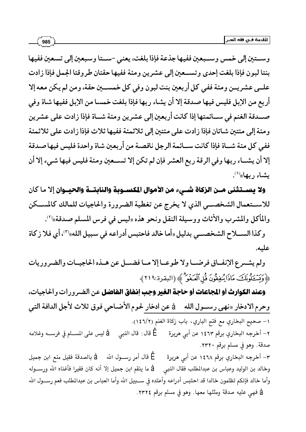 ولا يستثنى من الزكاة شيء من الأموال المكسوبة والنابتة والحيوان إلا ما كان للاستعمال الشخصي الذي لا يخرج عن تغطية الضرورة والحاجيات للمالك كالمسكن والمأكل والمشرب والأثاث ووسيلة النقل ونحو هذه «ليس في فرس المسلم صدقة» (¬2).