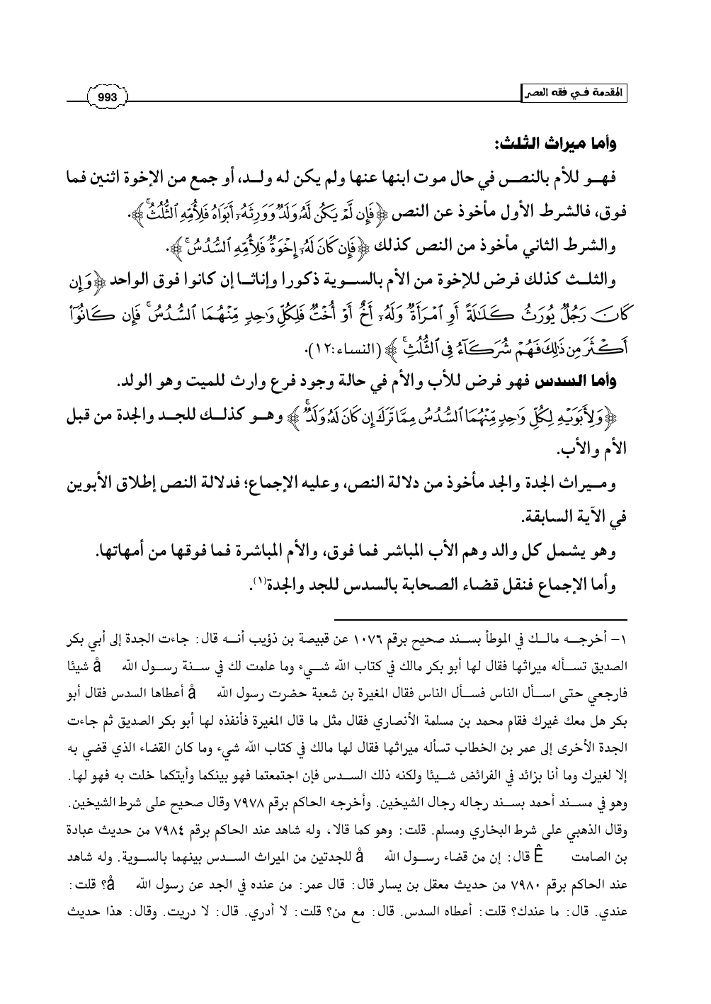 (¬1) - أخرجه مالك في الموطأ بسند صحيح برقم 1076 عن قبيصة بن ذؤيب أنه قال: جاءت الجدة إلى أبي بكر الصديق تسأله ميراثها فقال لها أبو بكر مالك في كتاب الله شيء وما علمت لك في سنة رسول الله صلى الله عليه وسلم شيئا فارجعي حتى اسأل الناس فسأل الناس فقال المغيرة بن شعبة حضرت رسول الله صلى الله عليه وسلم أعطاها السدس فقال أبو بكر هل معك غيرك فقام محمد بن مسلمة الأنصاري فقال مثل ما قال المغيرة فأنفذه لها أبو بكر الصديق ثم جاءت الجدة الأخرى إلى عمر بن الخطاب تسأله ميراثها فقال لها مالك في كتاب الله شيء وما كان القضاء الذي قضي به إلا لغيرك وما أنا بزائد في الفرائض شيئا ولكنه ذلك السدس فإن اجتمعتما فهو بينكما وأيتكما خلت به فهو لها. وهو في مسند أحمد بسند رجاله رجال الشيخين. وأخرجه الحاكم برقم 7978 وقال صحيح على شرط الشيخين. وقال الذهبي على شرط البخاري ومسلم. قلت: وهو كما قالا، وله شاهد عند الحاكم برقم 7984 من حديث عبادة بن الصامت رضي الله عنه قال: إن من قضاء رسول الله صلى الله عليه وسلم للجدتين من الميراث السدس بينهما بالسوية. وله شاهد عند الحاكم برقم 7980 من حديث معقل بن يسار قال: قال عمر: من عنده في الجد عن رسول الله صلى الله عليه وسلم؟ قلت: عندي. قال: ما عندك؟ قلت: أعطاه السدس. قال: مع من؟ قلت: لا أدري. قال: لا دريت. وقال: هذا حديث =