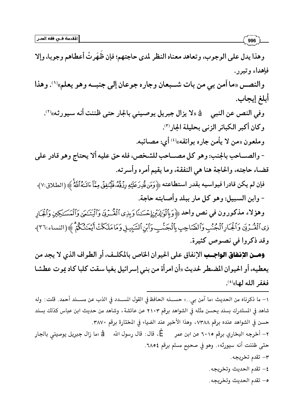 وهؤلاء مذكورون في نص واحد (وَبِالْوَالِدَيْنِ إِحْسَانًا وَبِذِي الْقُرْبَى وَالْيَتَامَى وَالْمَسَاكِينِ وَالْجَارِ ذِي الْقُرْبَى وَالْجَارِ الْجُنُبِ وَالصَّاحِبِ بِالجَنبِ وَابْنِ السَّبِيلِ وَمَا مَلَكَتْ أَيْمَانُكُمْ) (النساء: 36). وقد ذكروا في نصوص كثيرة.