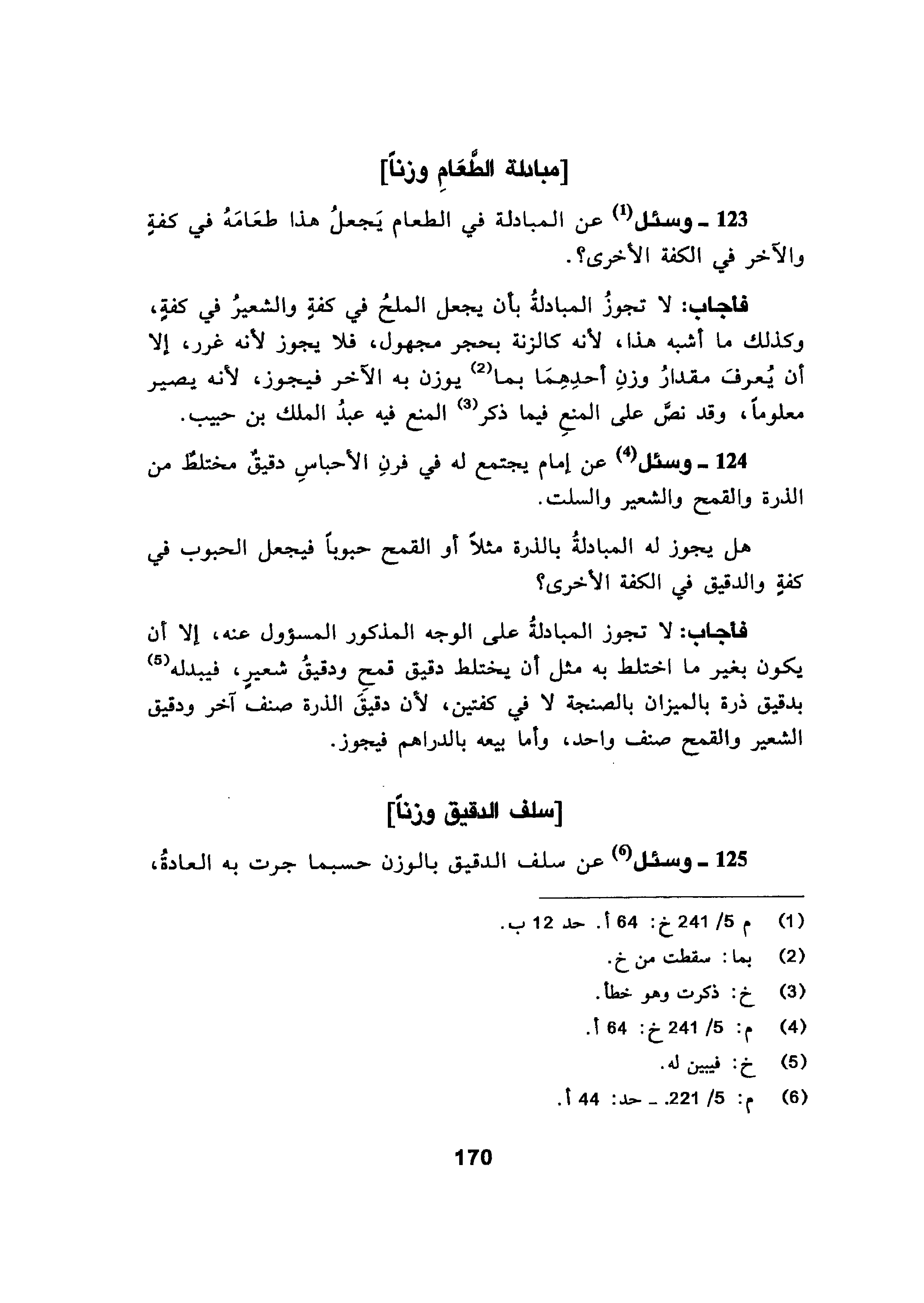 فأجاب: يجوز بيع ورق التوت بعضها ببعض تحرباً إذا كان البائع والمشتري عارفين بالتحري، أو قدَّمَا عَارِفاً يركنان لقوله، ويجوز التفاضلُ فيهما وأن يكون بعضها بقرية وبعضها بقرية أخرى، ولا تجوز المعاوضة بالعصير لعدم التناجز، ولا يتقاص، ولا أن يأخذ عصيراً في ثمن عصير آخر، ويجوز بيع العنب حِصْرماً إذا كان يقطع حصرماً، وقد كان بلغ أَنْ ينتفع به فيما ينتفع بالحصرم.