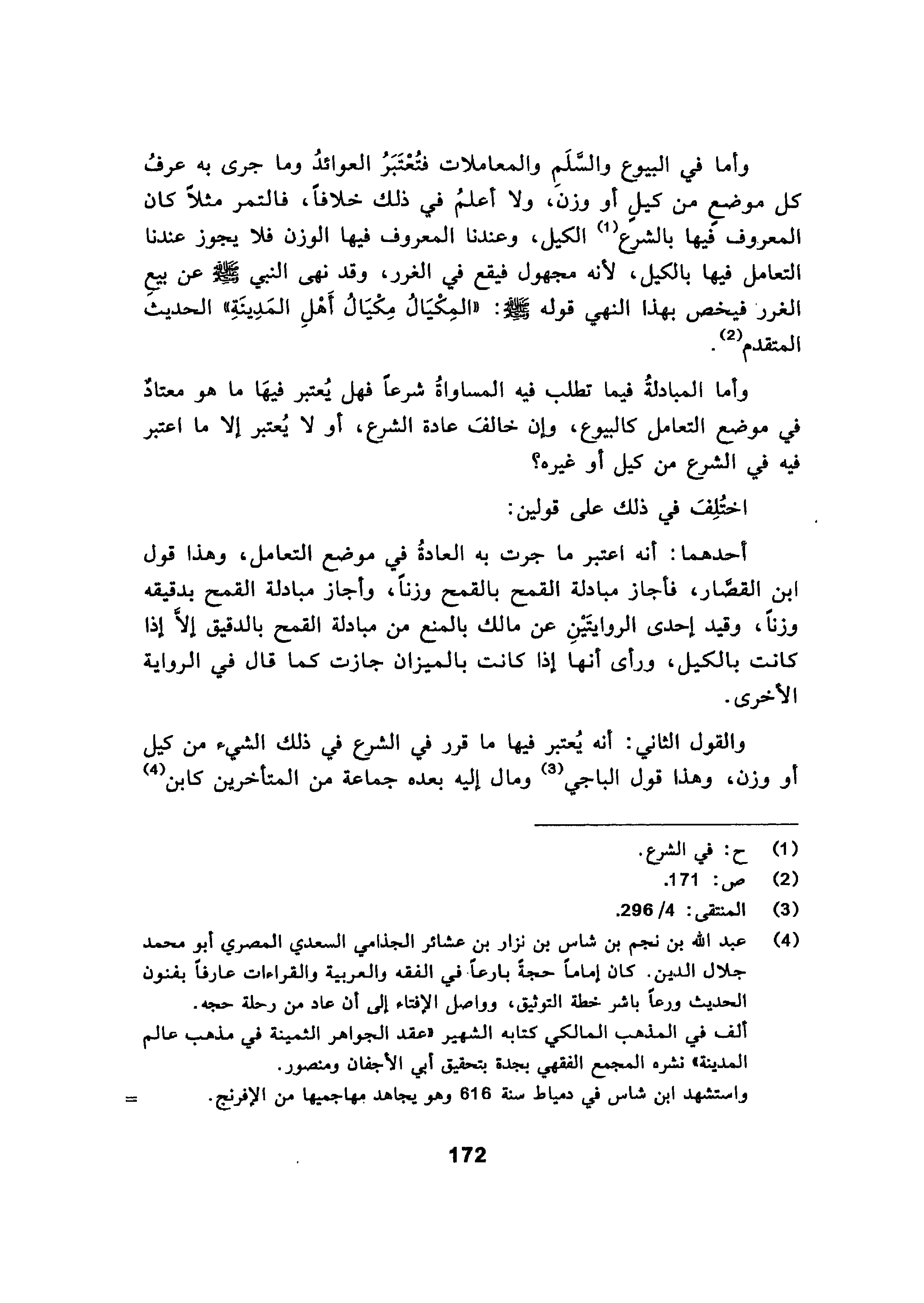 فأجاب: لا تجوزُ المبادلةُ بأن يجعل الملحُ في كفةٍ والشعيرُ في كفةٍ، وكذلك ما أشبه هذا، لأنه كالزنة بحجر مجهول، فلا يجوز لأنه غرر، إلا أن يُعرفَ مقدارُ وزنِ أحدِهِمَا بما يوزن به الآخر فيجوز، لأنه يصير معلوماً، وقد نصَّ على المنعِ فيما ذكر المنع فيه عبدُ الملك بن حبيب.