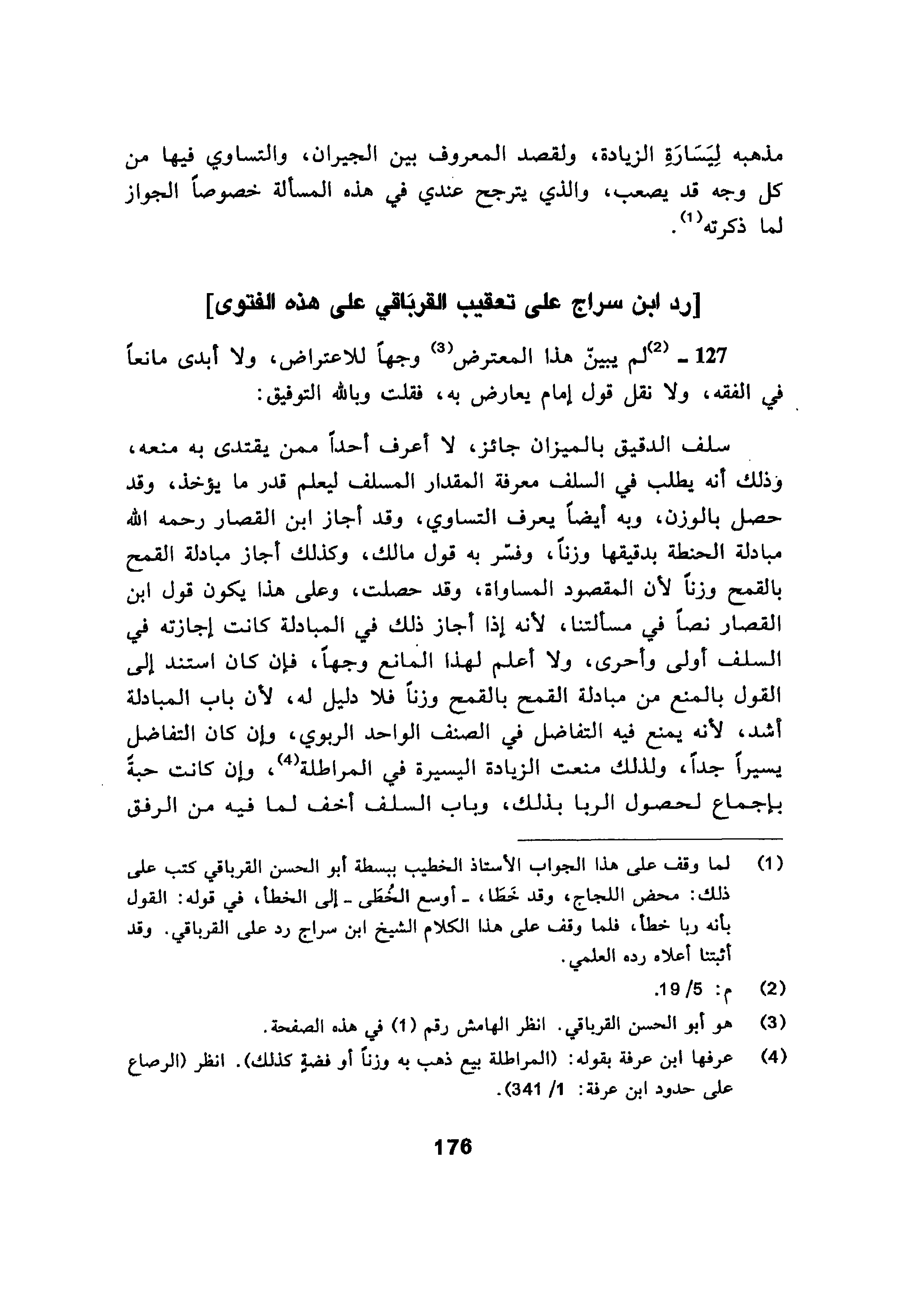 ووجه آخر: أن التفاضُلَ في مبادلة العرض بالعرض جائزةٌ، وفي القرض يمنع باتفاق مع الشرط، لكونه سلفاً جرَّ منفعةً، فدلَّ على أنَّ عِلَّةَ المنعِ في البابين ليست واحدة وأنها في المبادلة التفاضلُ وفي السلف الوقوعُ في سلفٍ جرَّ منفعةً، وإذا افترقت علةُ المنعِ لم يُقَسْ أحدُ البابين على الآخر، وهذا كله على طريقة الباجي.