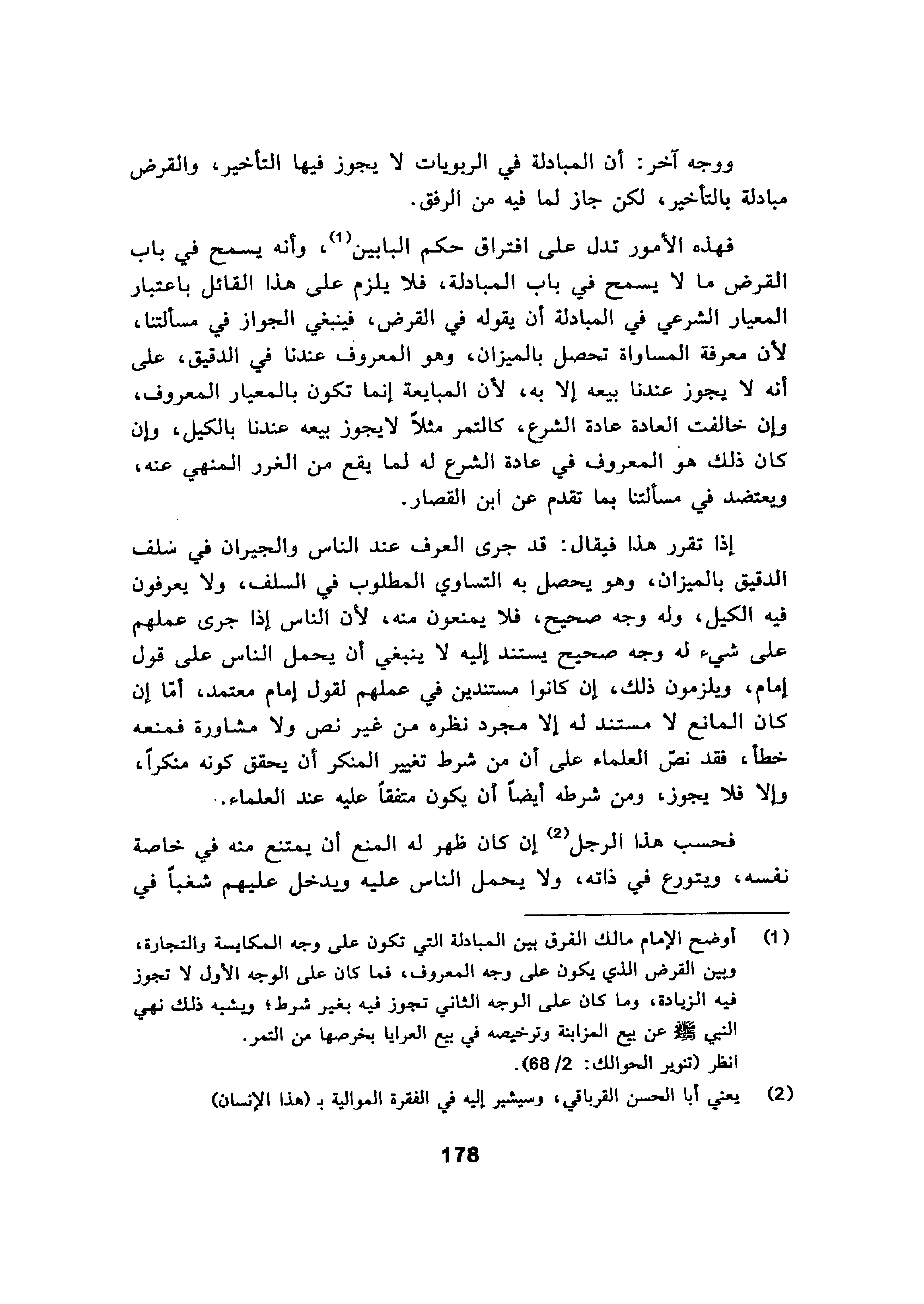 سلف الدقيق بالميزان جائز، لا أعرف أحداً ممن يقتدى به منعه، وذلك أنه يطلب في السلف معرفة المقدار المسلف ليعلم قدر ما يؤخذ، وقد حصل بالوزن، وبه أيضاً يعرف التساوي، وقد أجاز ابن القصار رحمهالله مبادلة الحنطة بدقيقها وزناً، وفسّر به قول مالك، وكذلك أجاز مبادلة القمح بالقمح وزناً لأن المقصود المساواة، وقد حصلت، وعلى هذا يكون قول ابن القصار نصاً في مسألتنا، لأنه إذا أجاز ذلك في المبادلة كانت إجازته في السلف أولى وأحرى، ولا أعلم لهذا المانع وجهاً، فإن كان استند إلى القول بالمنع من مبادلة القمح بالقمح وزناً فلا دليل له، لأن باب المبادلة أشد، لأنه يمنع فيه التفاضل في الصنف الواحد الربوي، وإن كان التفاضل يسيراً جداً، ولذلك منعت الزيادة اليسيرة في المراطلة، وإن كانت حبةً بإجماع لحصول الربا بذلك، وباب السلف أخف لما فيه من الرفق