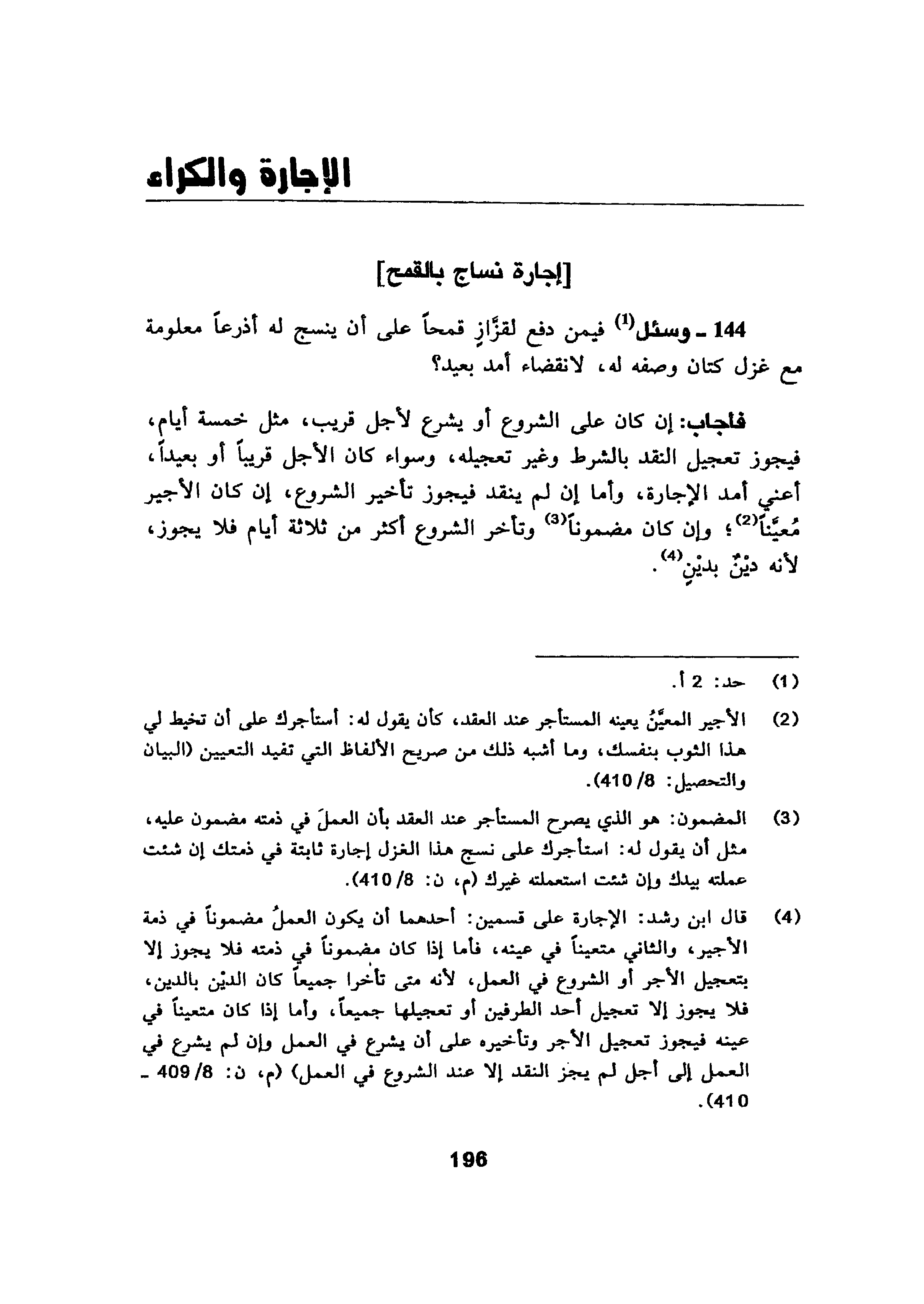 فأجاب: إن كان على الشروع أو يشرع لأجل قريب، مثل خمسة أيام، فيجوز تعجيل النقد بالشرط وغير تعجيله، وسواء كان الأجل قريباً أو بعيداً، أعني أمد الإجارة، وأما إن لم ينقد فيجوز تأخير الشروع، إن كان الأجير مُعيَّناً وإن كان مضموناً وتأخر الشروع أكثر من ثلاثة أيام فلا يجوز، لأنه ديْنٌ بديْنٍ.