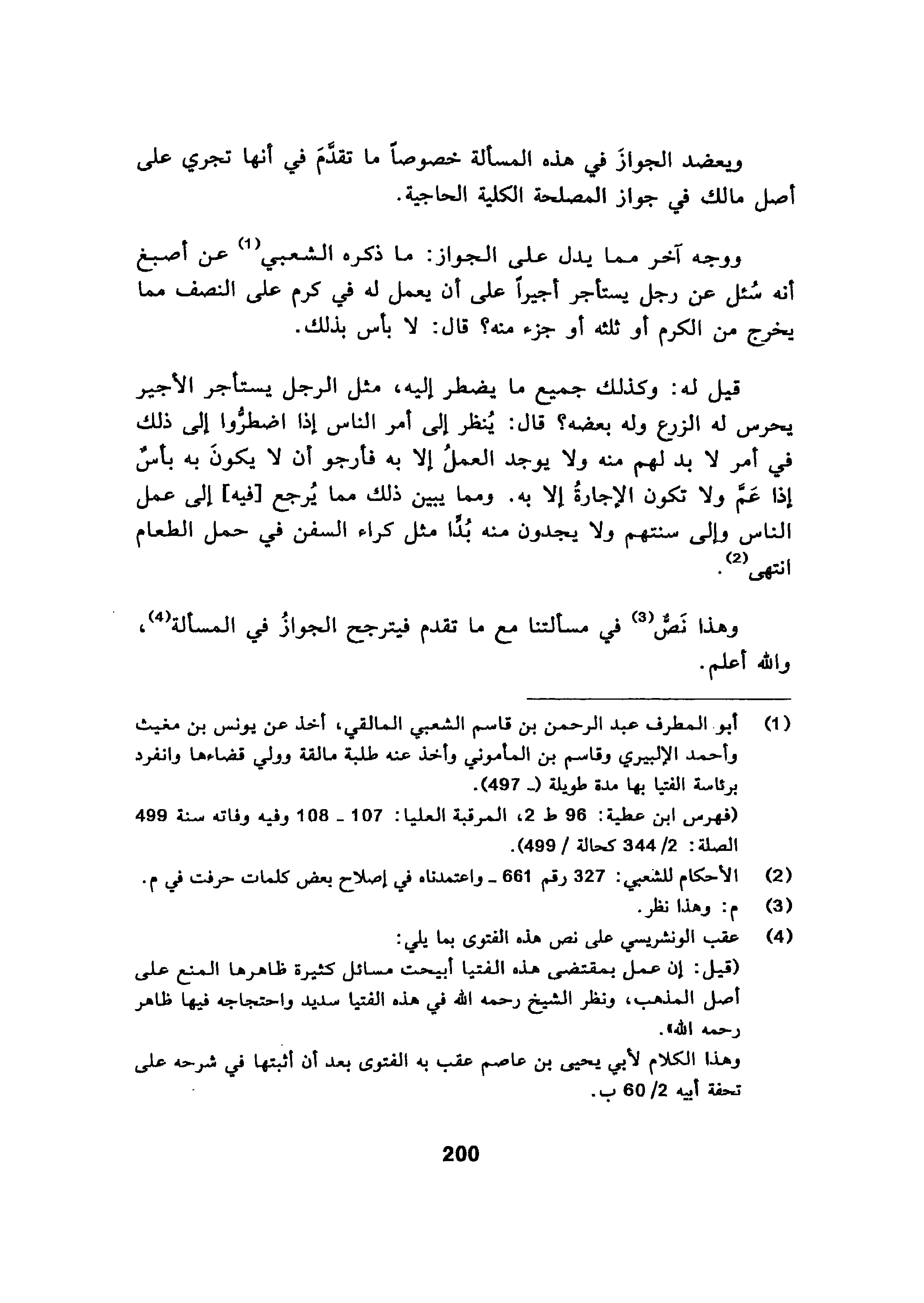 قيل له: وكذلك جميع مما يضطر إليه، مثل الرجل يستأجر الأجير يحرس له الزرع وله بعضه؟ قال: يُنظر إلى أمر الناس إذا اضطرُّوا إلى ذلك في أمر لا بد لهم منه ولا يوجد العملُ إلا به فأرجو أن لا يكونَ به بأسٌ إذا عَمَّ ولا تكون الإجارةُ إلا به. ومما يبين ذلك مما يُرجع فيه إلى عمل الناس وإلى سنتهم ولا يجدون منه بُدٍّا مثل كراء السفن في حمل الطعام انتهى.